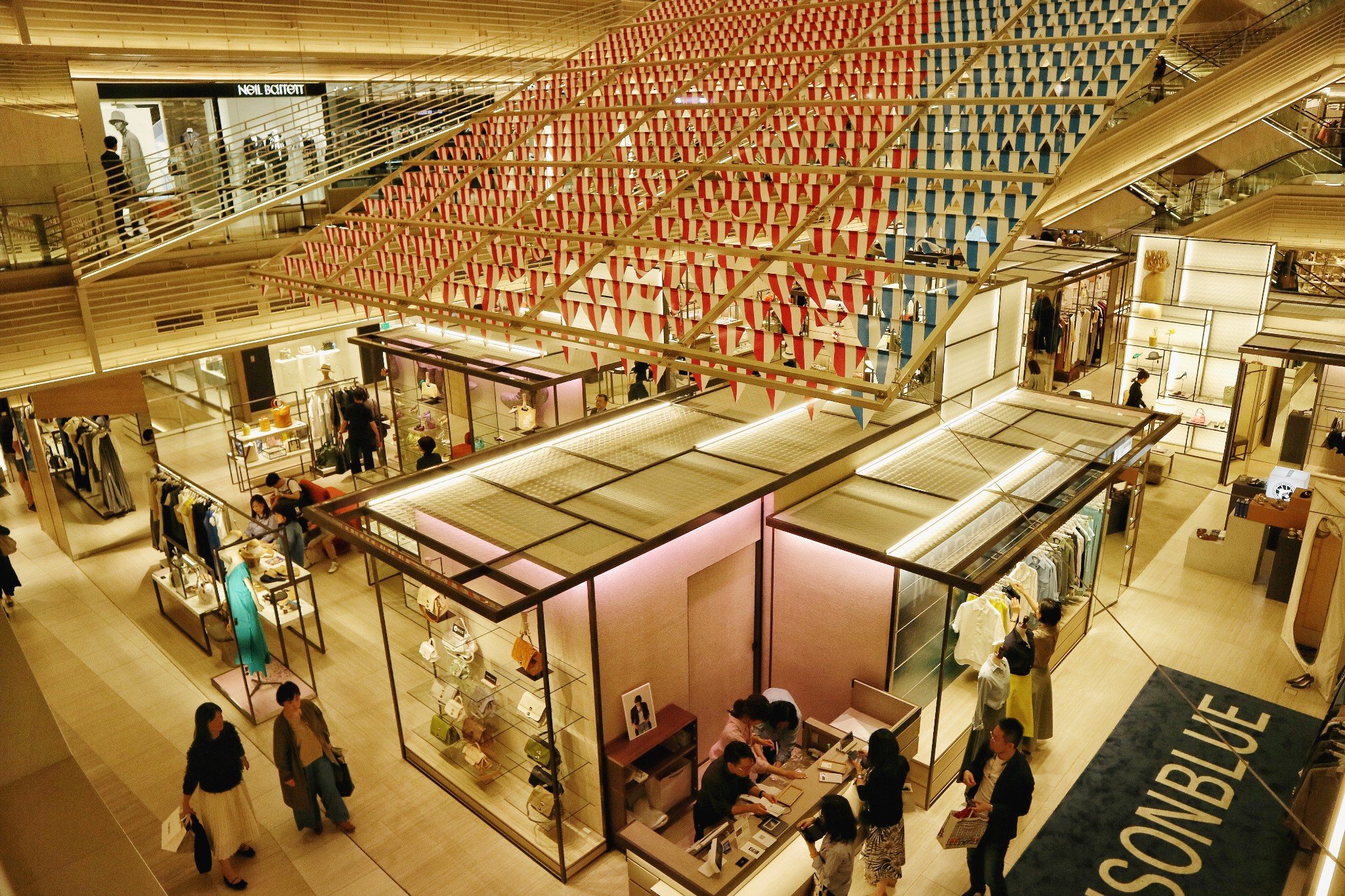 一层的开放式店铺,直通顶层这套设计定期会根据不同的季节,节日装修主题会随之变化。