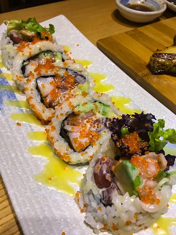 譬如口感极佳的活鲷鱼刺身,泉城日料店中不多见的鰤鱼刺身。烤鳗鱼和芒果鹅肝手握也都拥有不错的味道