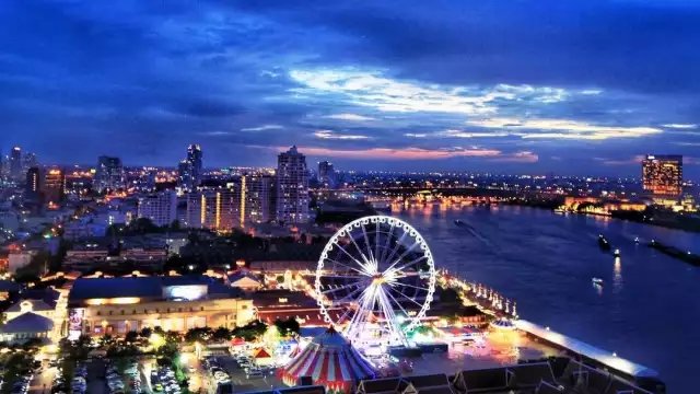 入住的公寓是在摩天轮旁边的一个最高建筑,江边景色一览无余,可以看下图。达到酒店就是傍晚了,恰好欣赏一下湄南河的夜景。