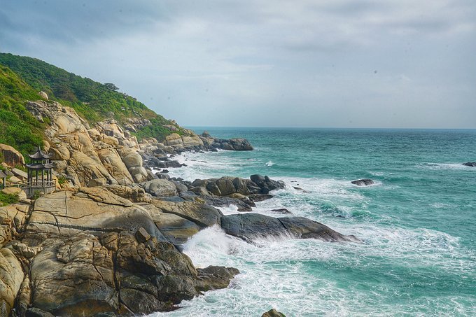 晚上的三亚湾非常热闹,沿线各家酒店的啤酒吧人气十足,也有好多街头演出可以观看。另外,傍晚的三亚湾可以看见渔民赶海拉网的景象,同时可以欣赏红霞满天的日落美景。由于三亚湾的海岸线绵长而且视角开阔,所以在这里看到的落日非常壮观,傍晚带着相机来这里走走,一定收获颇丰。