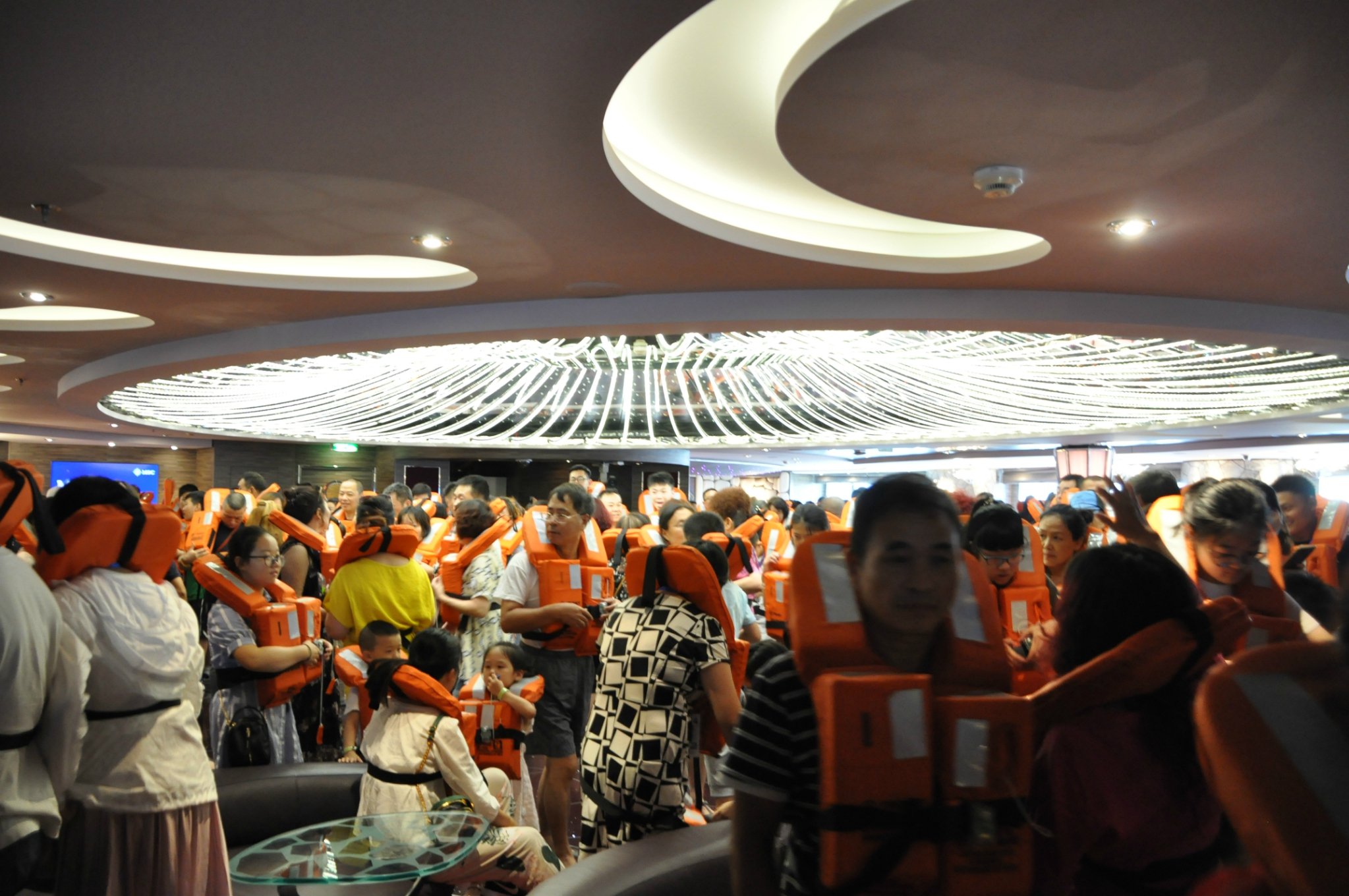 上船之后召集全员先到大剧场进行开船说明会。因为船上服务人员都是外籍。不过不会外语的朋友也不用担心。他们都特别友好,你就是比划他们也能尽力去理解的。房卡上面也都是英文的,还有很多玄机在里面。主持人告诉大家房卡的使用方法,MSC的APP使用方法,挂银行卡的方法等等。然后就到我们的救生演习的地方集合了。大家都带着救生衣。发生了泰国的沉船事件,大家都比较重视这个了。船方安排的特别严格,参加演习的要刷房卡。没有参加演习的要在第二天补一个救生演习……