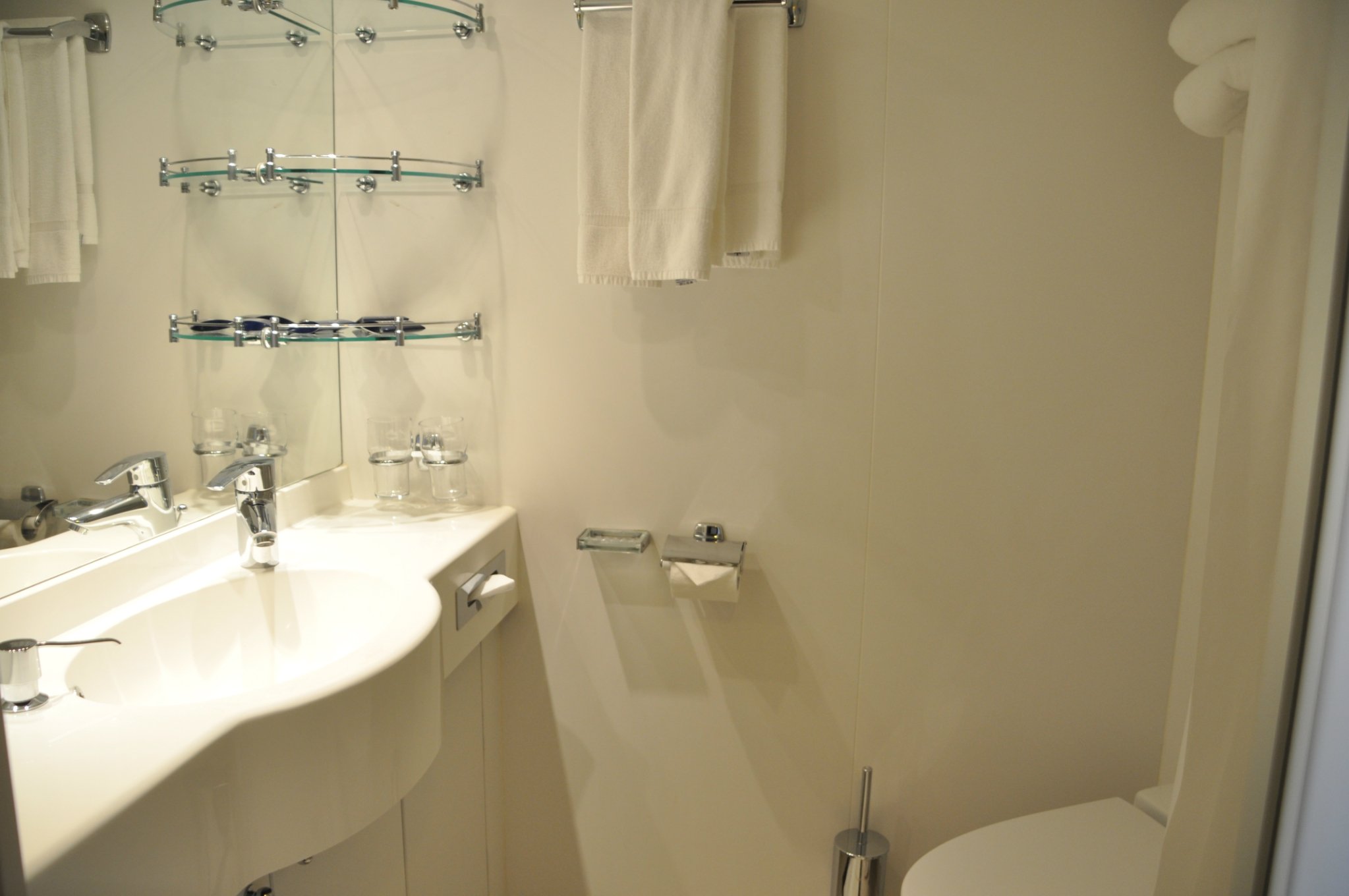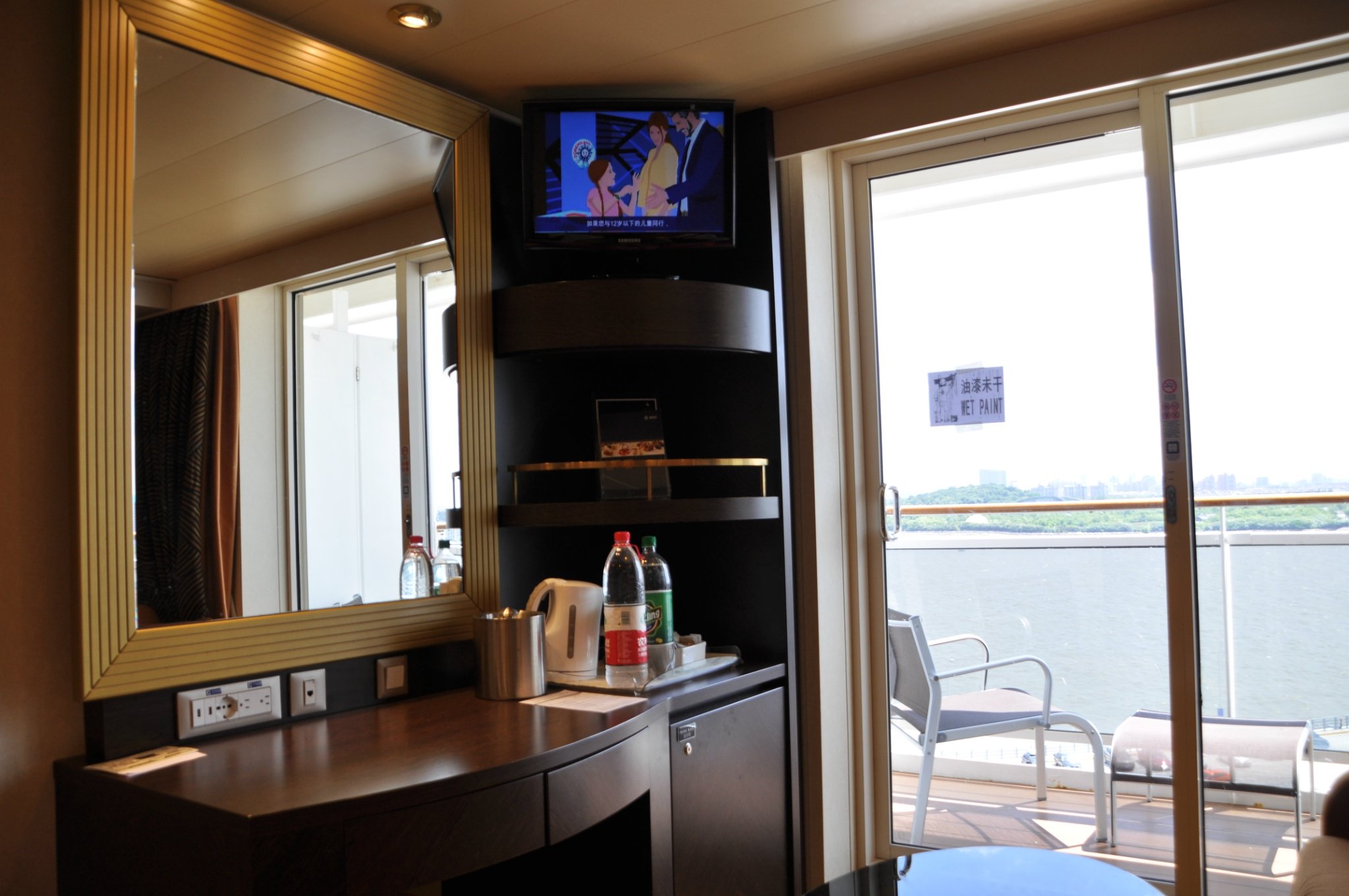 一打开门,温度合适的冷气就涌出来了。左侧是衣柜里面有超级多的衣架,获得了洗衣服洁癖爱好者我妈的好评。右侧是浴室超级洁净的纯白色,麻雀虽小五脏俱全。由于该邮轮是环保协议,所以只备了少量浴液,洗漱用品必须一律自备。在浴室里有晾衣绳。浴室灯光也非常明亮。卧室配有两张单人床和一张沙发。沙发在晚上可以拉出来成为一个双人床。所以睡起来三个人绰绰有余了。桌子上配有小水吧,电冰箱,充电口有一个220V另外几个都是欧标美标。所以出来还是多带几个转换头比较好。虽然在海上没有信号,不玩手机很省电。但是拍照片也是要用电的~啊哈哈