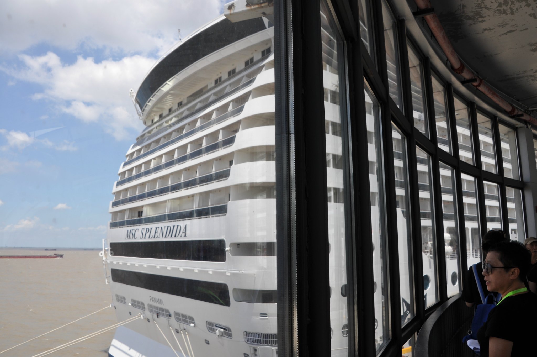 起航啦~旁边的量子号和我们的辉煌号一同出发。几乎所有的人都跑到甲板上来拍照片了。黄色的长江啊……
