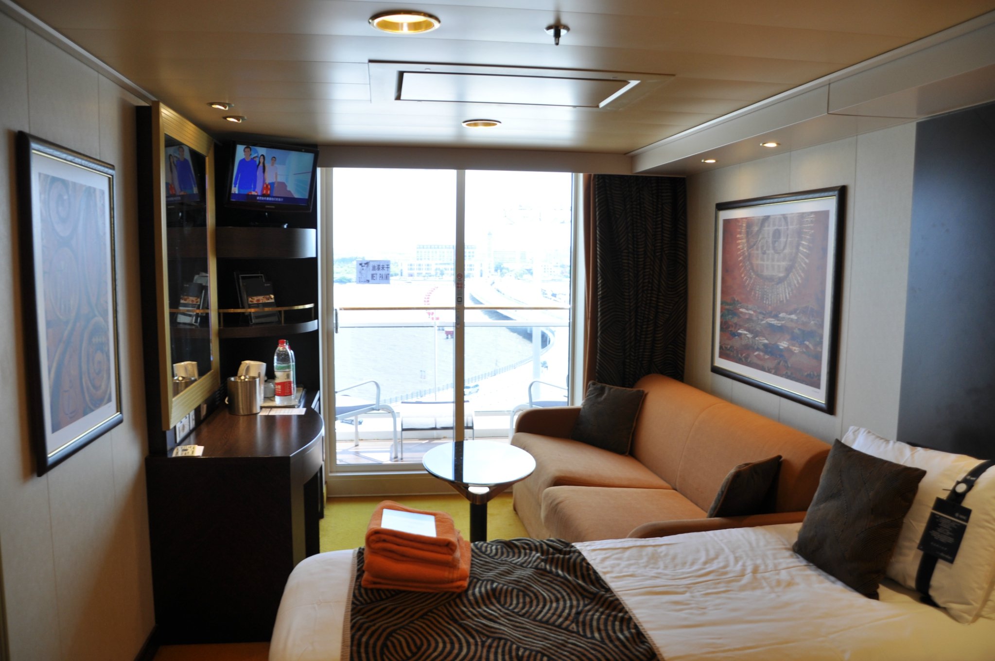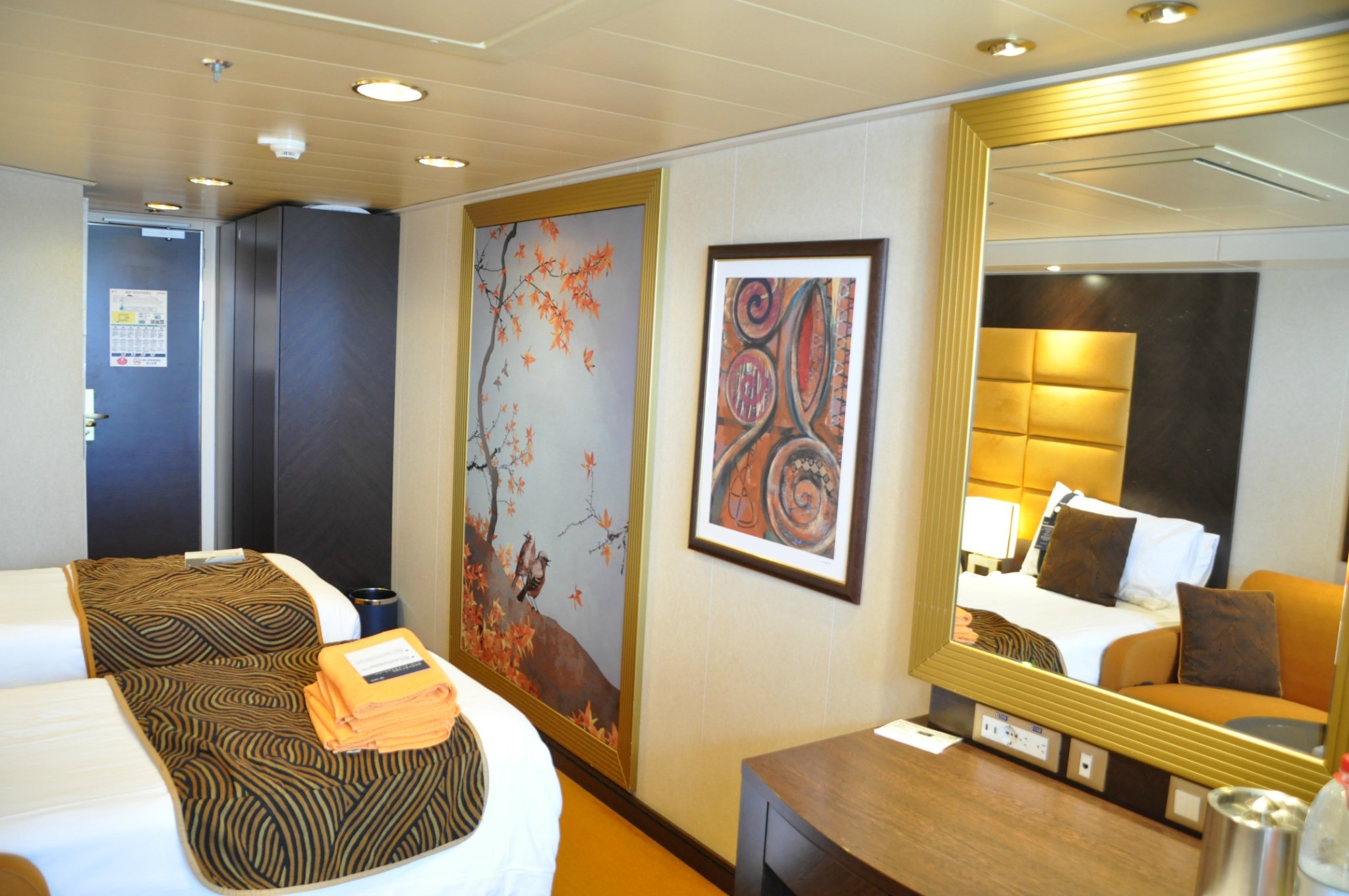 我们一家动作迅速找到我们的房间在轮船的后部顶层。视野开阔的阳台三人房。一进屋子地中海的橘黄色暖色调的布置让人心情愉悦。据说每一件客房物品都是企业掌门人Aponte夫人精心挑选的,床和枕头是意大利顶级床品朵礼兰。卫浴是德国制造的高仪。整体的布置非常有地中海风格,走廊的墙面上都挂着游轮阳台望出去圣托里尼的风景画。当然每个角度都不同就是了。