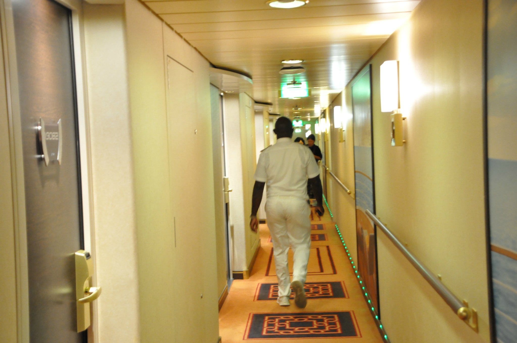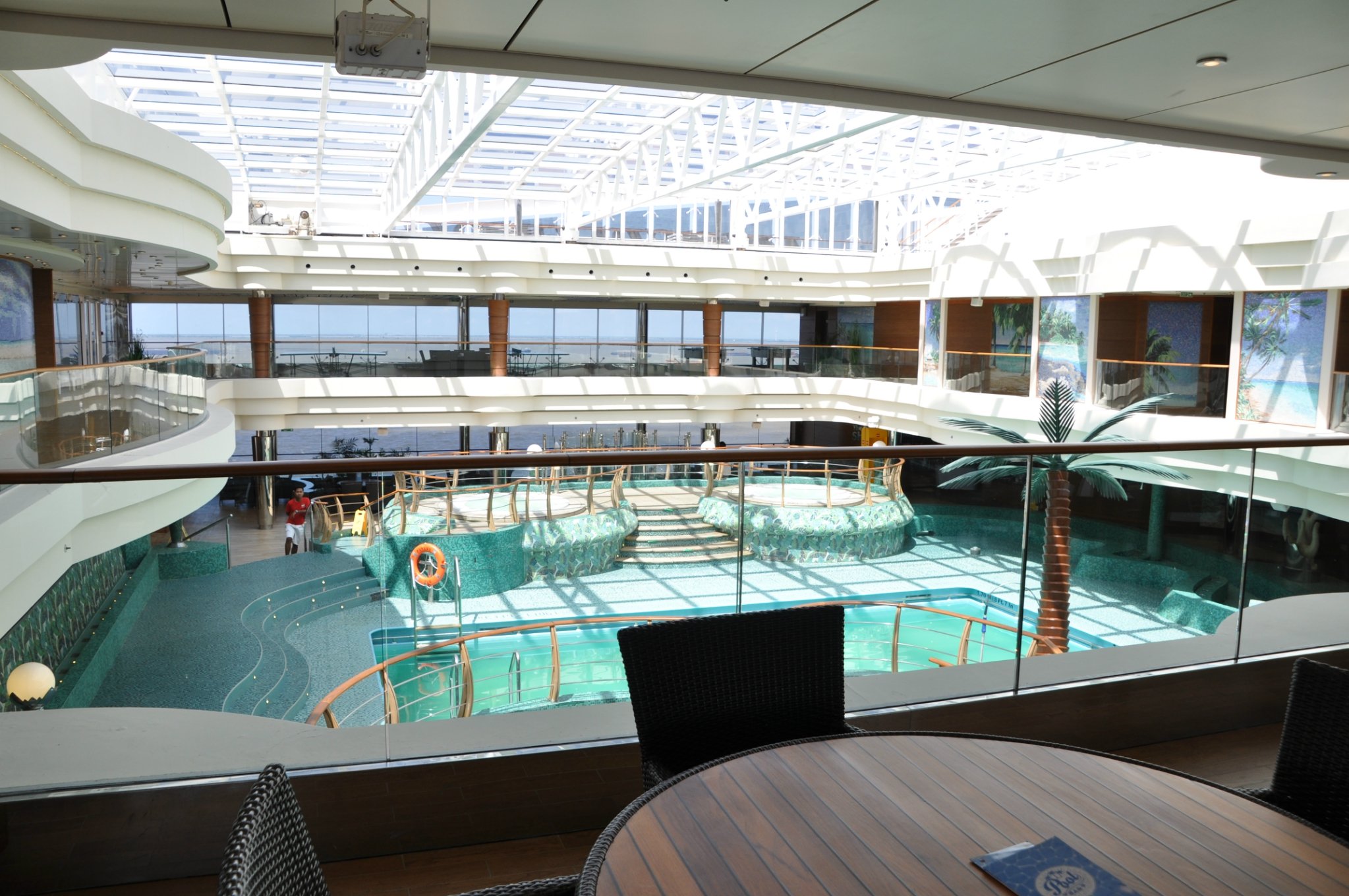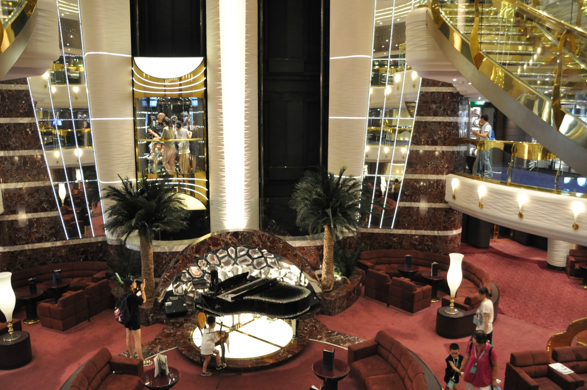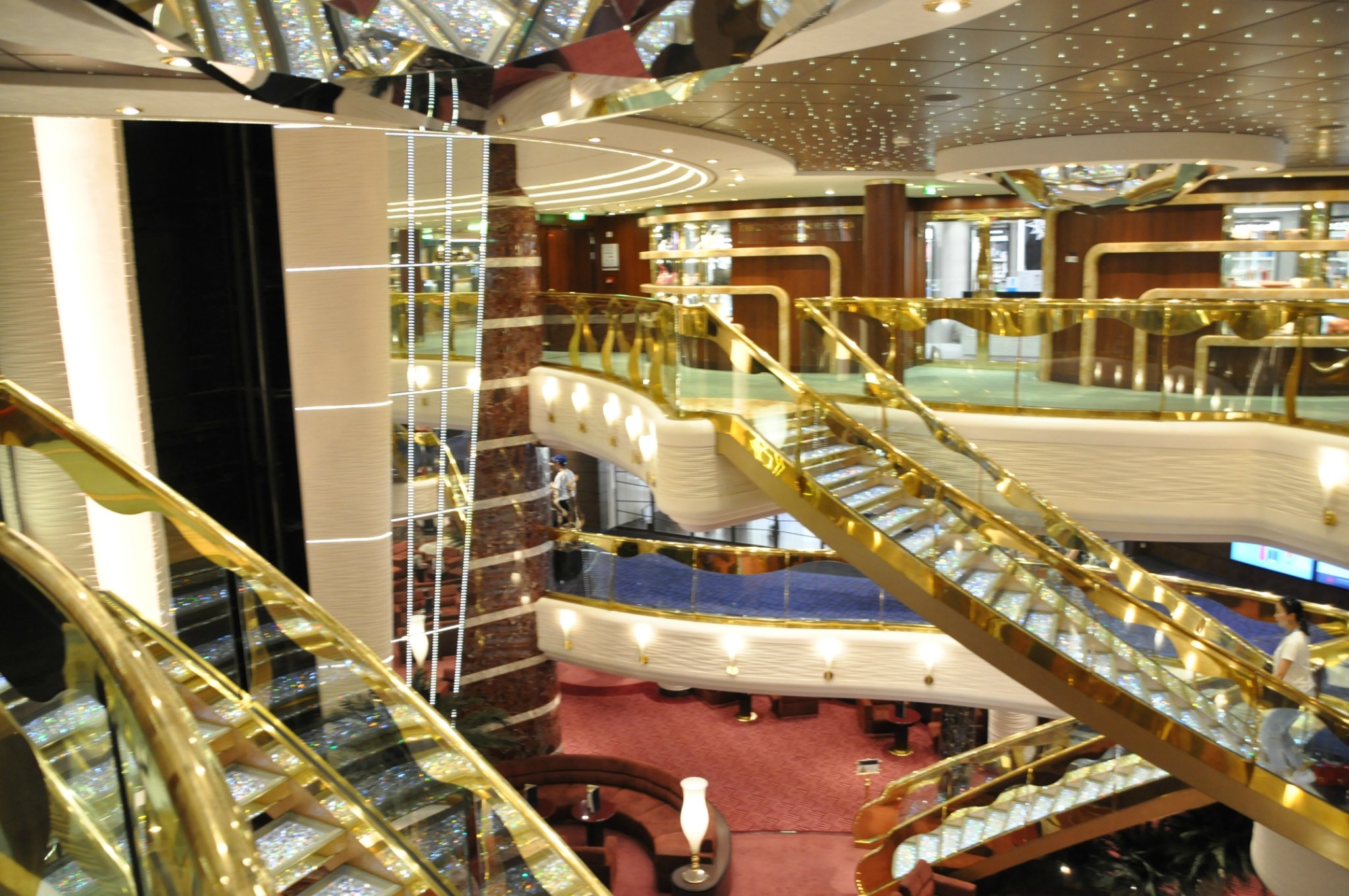 还没有进到船内,美丽的金发美女服务小姐还有身材健硕的海员就给人良好的感觉,登船的时候为了让乘客熟悉船内设施,同时也是促进你消费,所以用围栏的方法让你在船里饶了个大圈子,看到了几个酒吧几个付费餐厅,水景楼梯,赌场,奢侈品店等等。当然还有和美丽的船员合影等等等等。我一开始就制定了计划方针,趁着我们上船比较早,人比较少。我们先到水景楼梯和游泳池去拍照片。事实证明我们是对的。