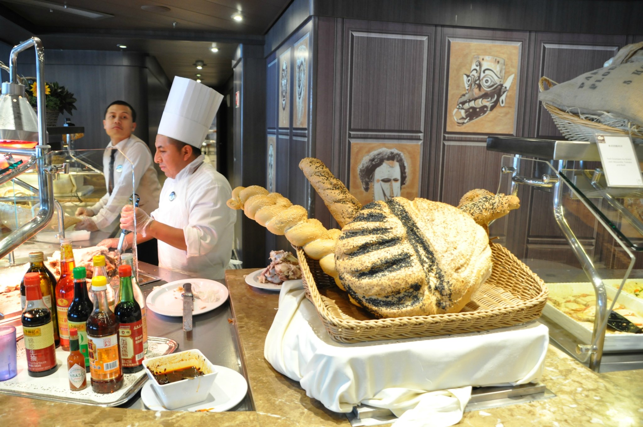 我们信步游览到自助餐厅,因为之前看网友说自助餐厅人特别多。的确大家上船之后估计有一半的人都在这里填饱肚皮了。据说这个餐厅可以容纳差不多3000人同时就餐的超大体量。每天20小时以上不停的供应美食。非就餐时段菜品都是以小吃为主,正餐时段简直就是美食天堂。我住过很多奢华五星级酒店,这个规模没有谁能比的。为了满足中国人的中国胃,餐厅还配有各种不同的辣椒酱李锦记酱油各种辣椒油等等。你能想象那是一个中国主厨指挥下的一帮外国人在做的中餐么!?想想都觉得很有趣。