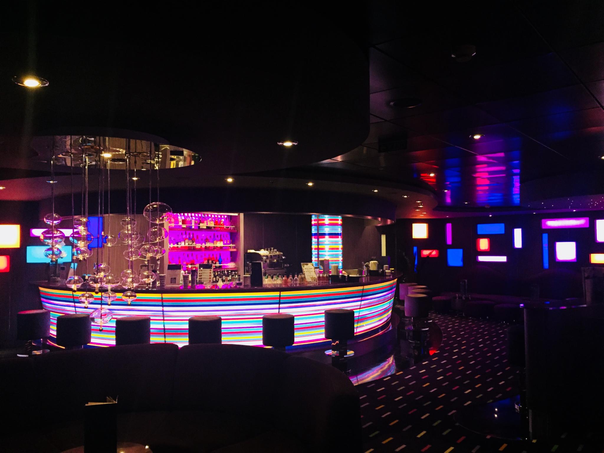 这是我最喜欢的一个酒吧,色调是紫色彩虹。还有一个超大的原型大沙发……躺在上面听音乐!