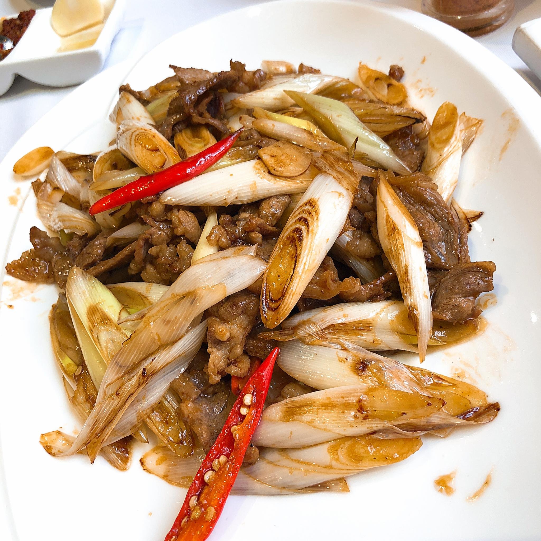 葱爆羊肉:对我来说,羊肉的膻味还是比较重的,但是整道菜非常的入味,配有蒜和辣椒,可以就着一起吃。