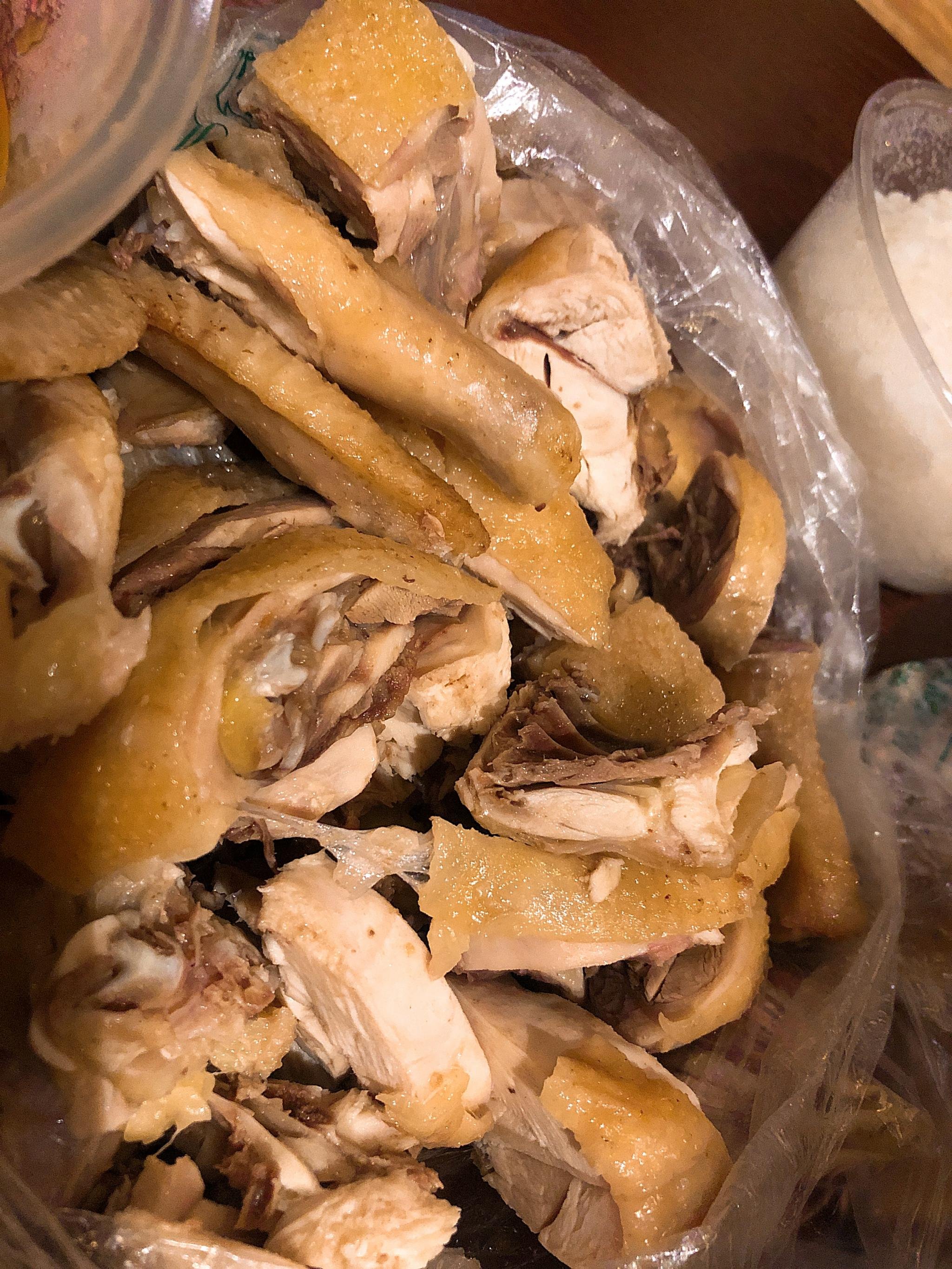 白斩鸡:白斩鸡很有弹性,肉质不失特别老,水分也比较多,配有蘸料。
