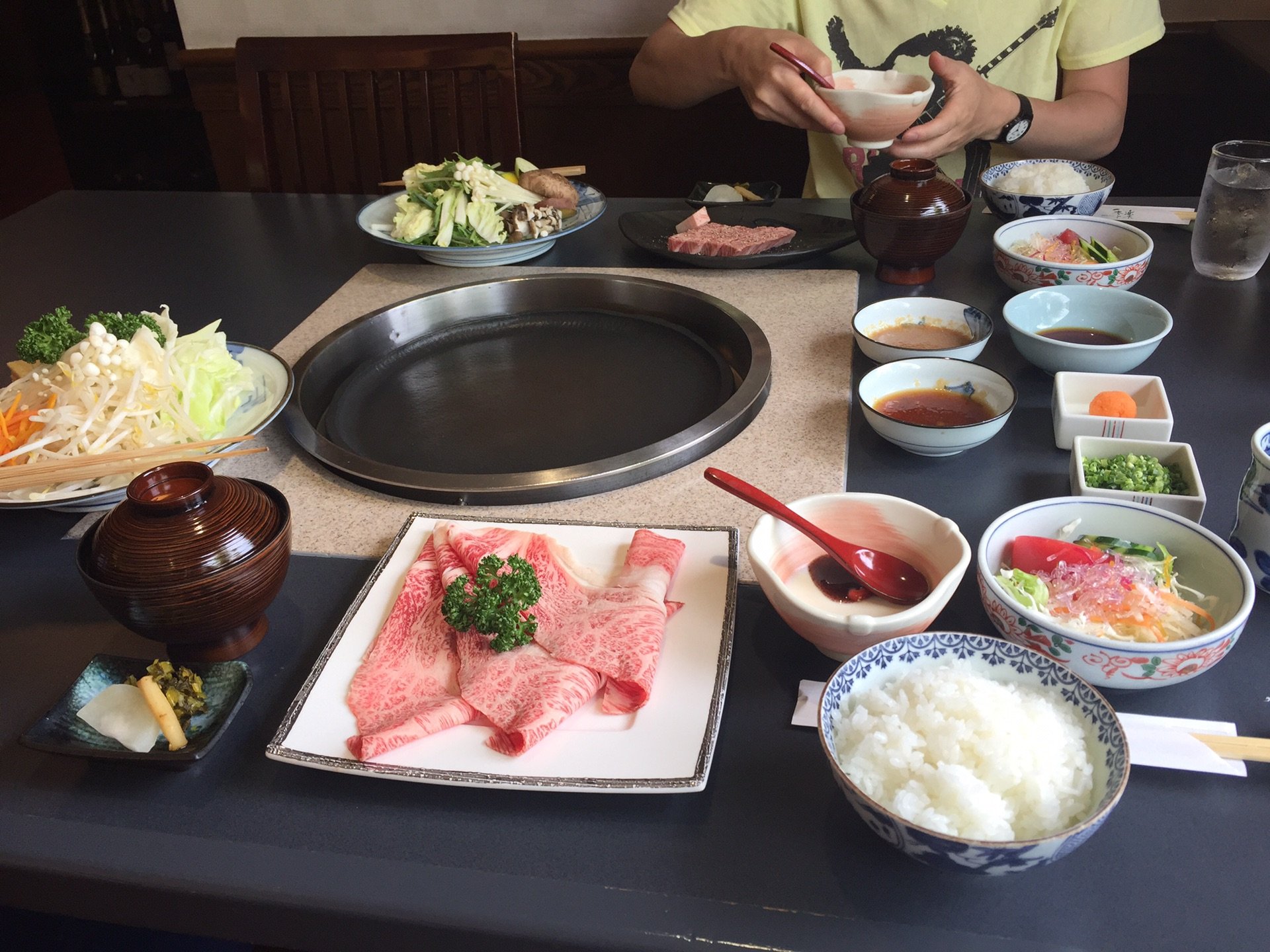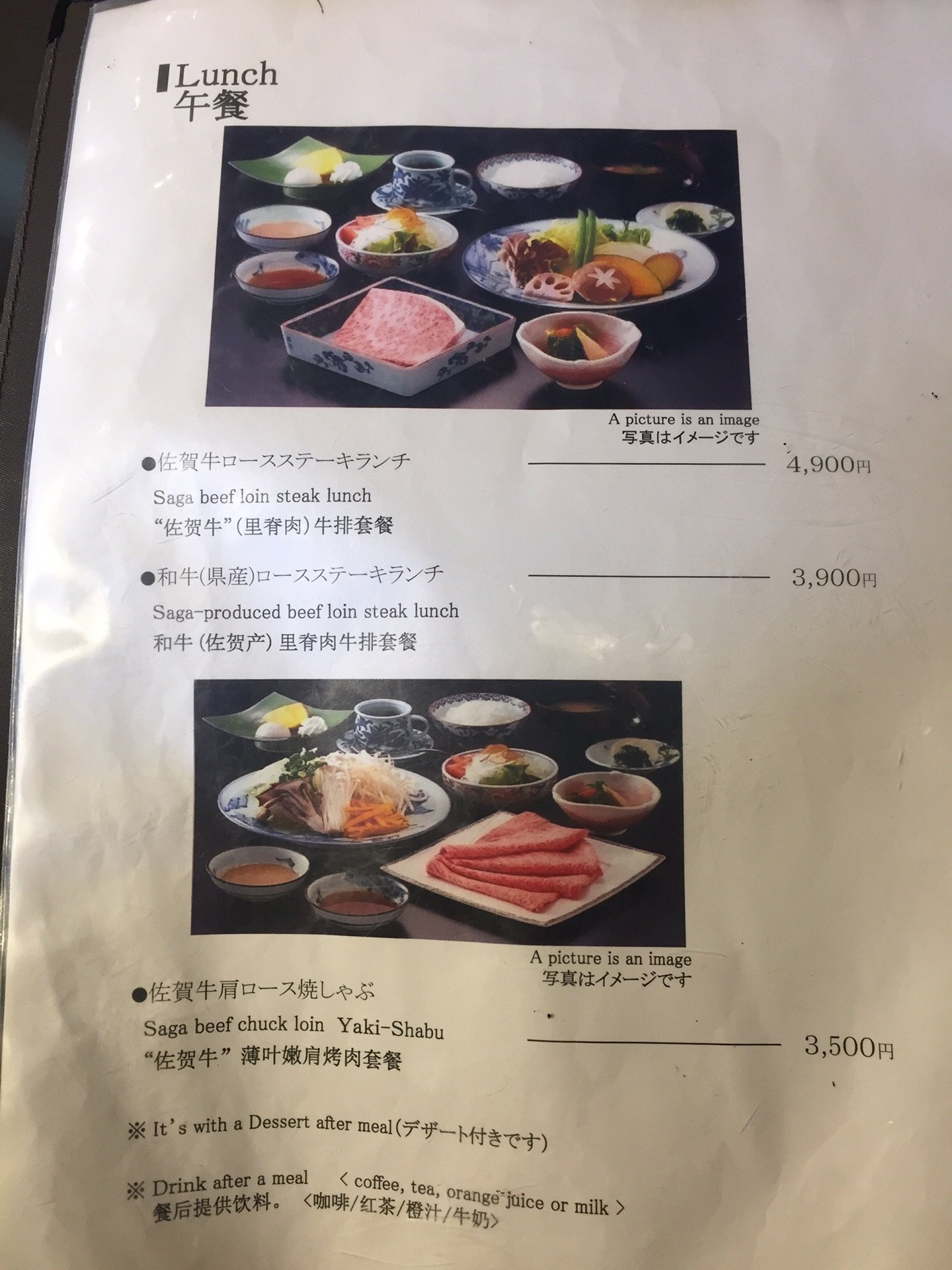 并不是所有 佐贺 的牛都可以被称作 佐贺 牛(Saga beef),没有达到一定标准的只是 佐贺 产的牛(Saga-produced beef)。中午的套餐只有这三个,我们选了“ 佐贺 牛"(里脊肉)牛排套餐和“ 佐贺 牛"薄叶嫩肩烤肉套餐。