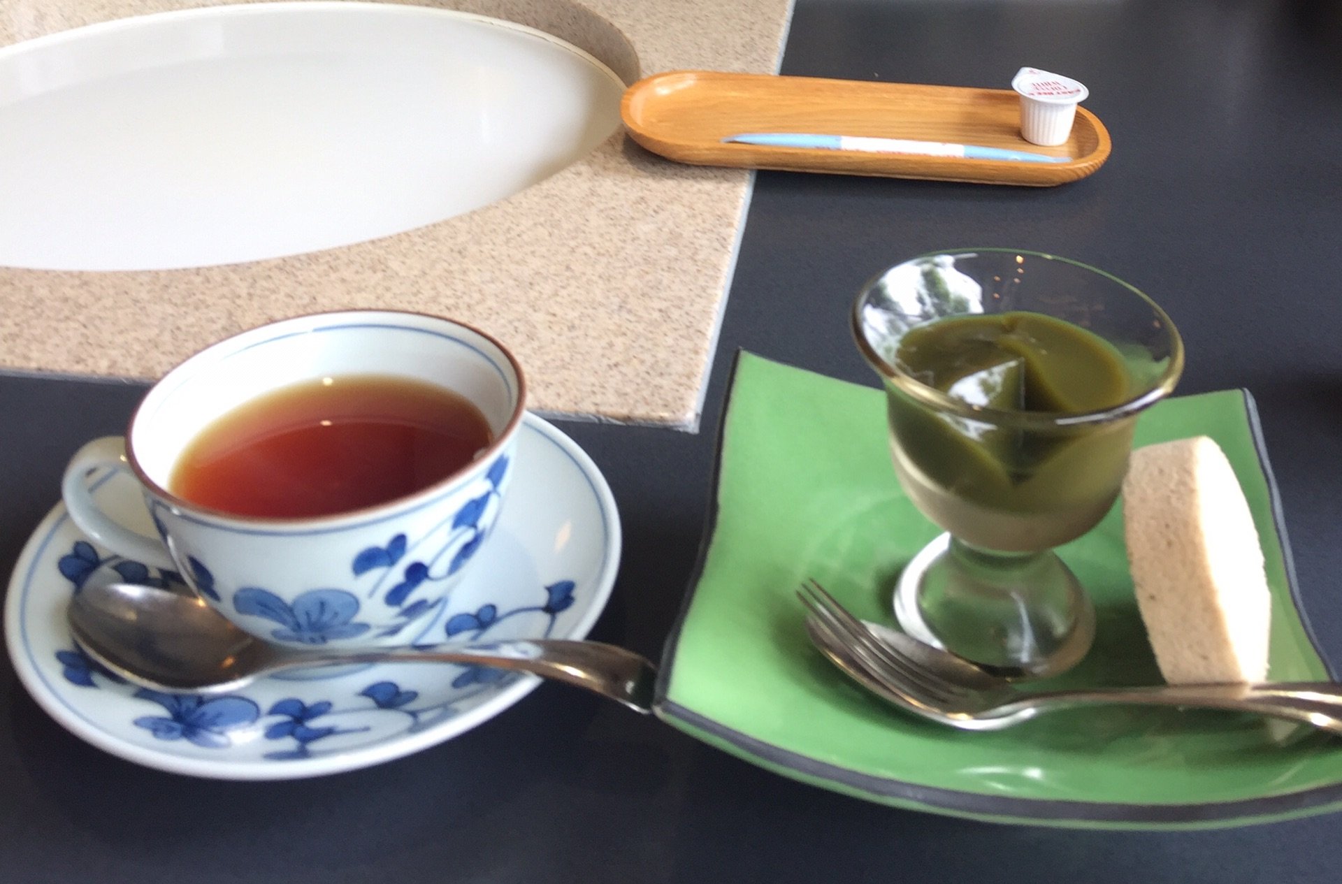 原本以为餐后只有饮料,居然还上了一份甜点—抹茶冻和蛋糕卷,吃撑了.2.烤肉时油烟太重