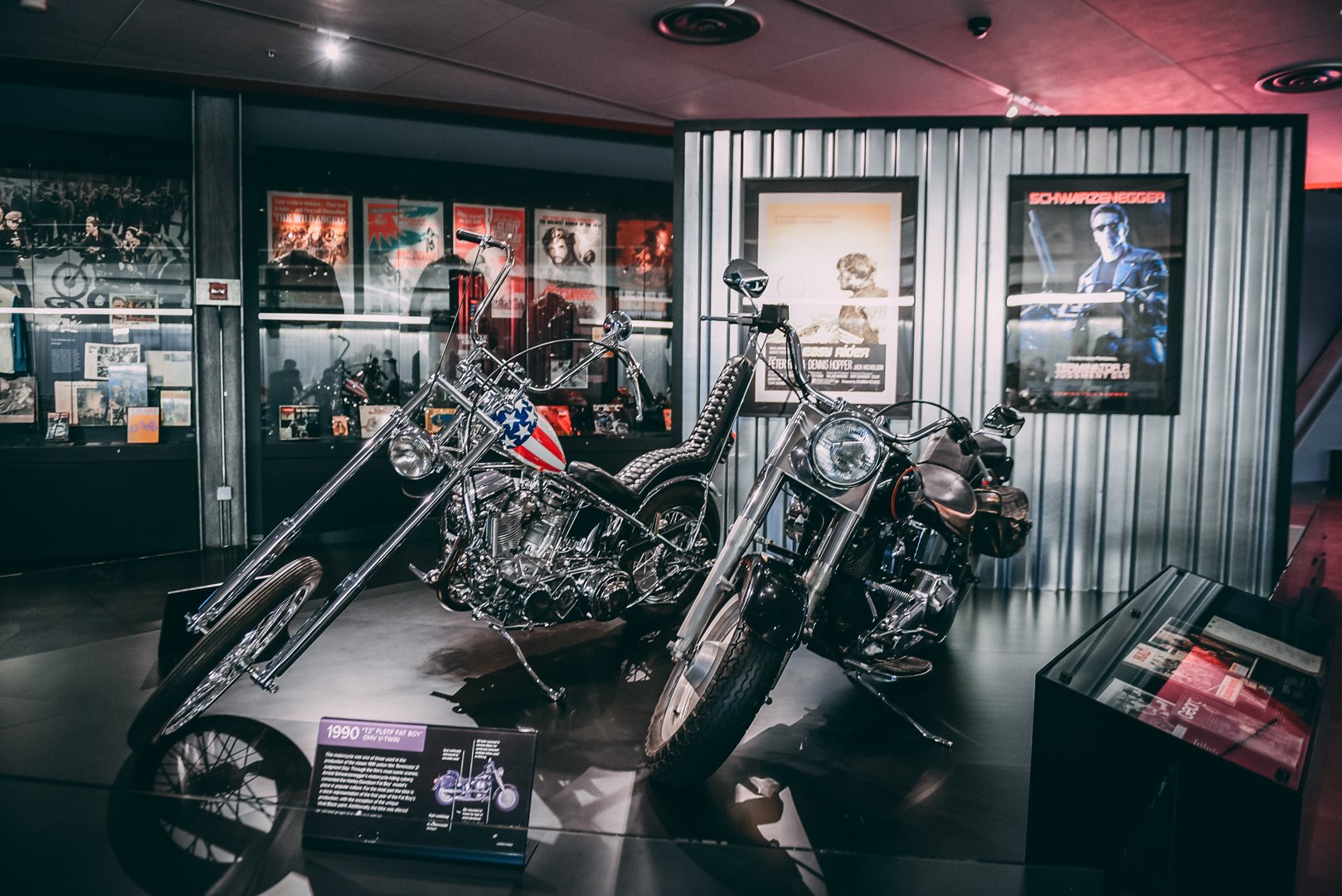 这个展厅的主题是哈雷对 美国 当代文化的影响,展品有包括《魔鬼终结者》在内多部电影中出现过的哈雷车款,众多电影明星曾经使用过的机车夹克等物品,还有不同年代的哈雷海报,复古的色彩勾勒出哈雷摩托车作为一个视觉符号的冲击力。