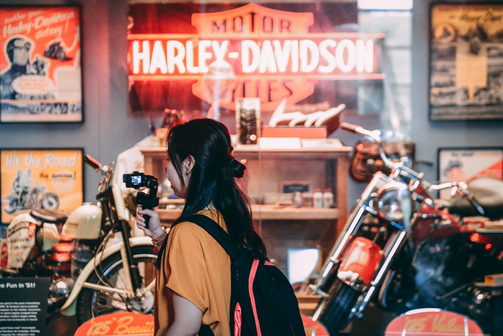一楼展厅展出了数十辆不同年代不同款型的哈雷摩托车,充满工业风格的空间中,车队气势浩大,恰到好处的灯光烘托出车身上每一个维护得锃亮的细节,让我们不禁惊呼:“帅气!”