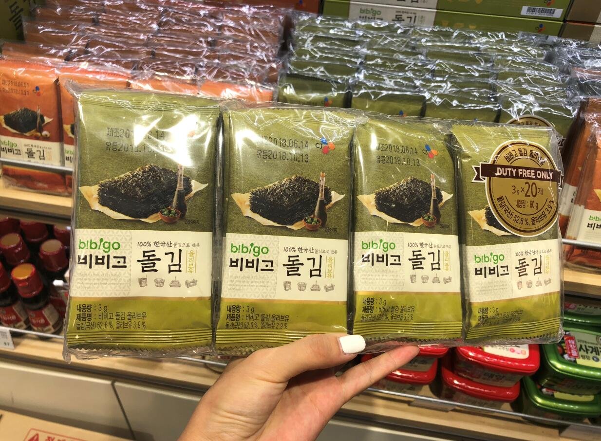 新罗免税店有好多样的必品阁海苔,还有礼盒装的,送人也有面儿