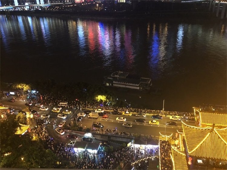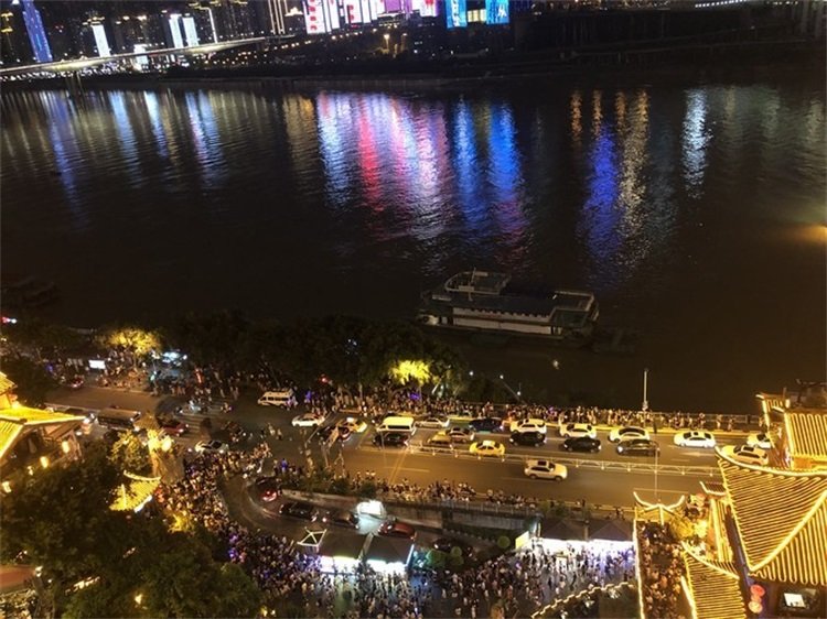 从顶层往下看,下面的人越来越多,还能看到边上的嘉陵江。