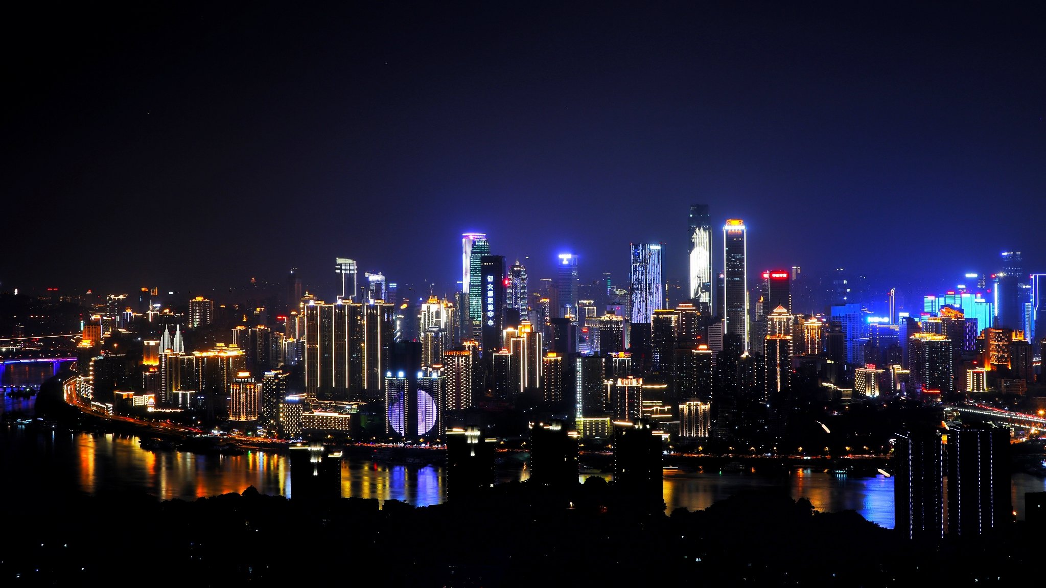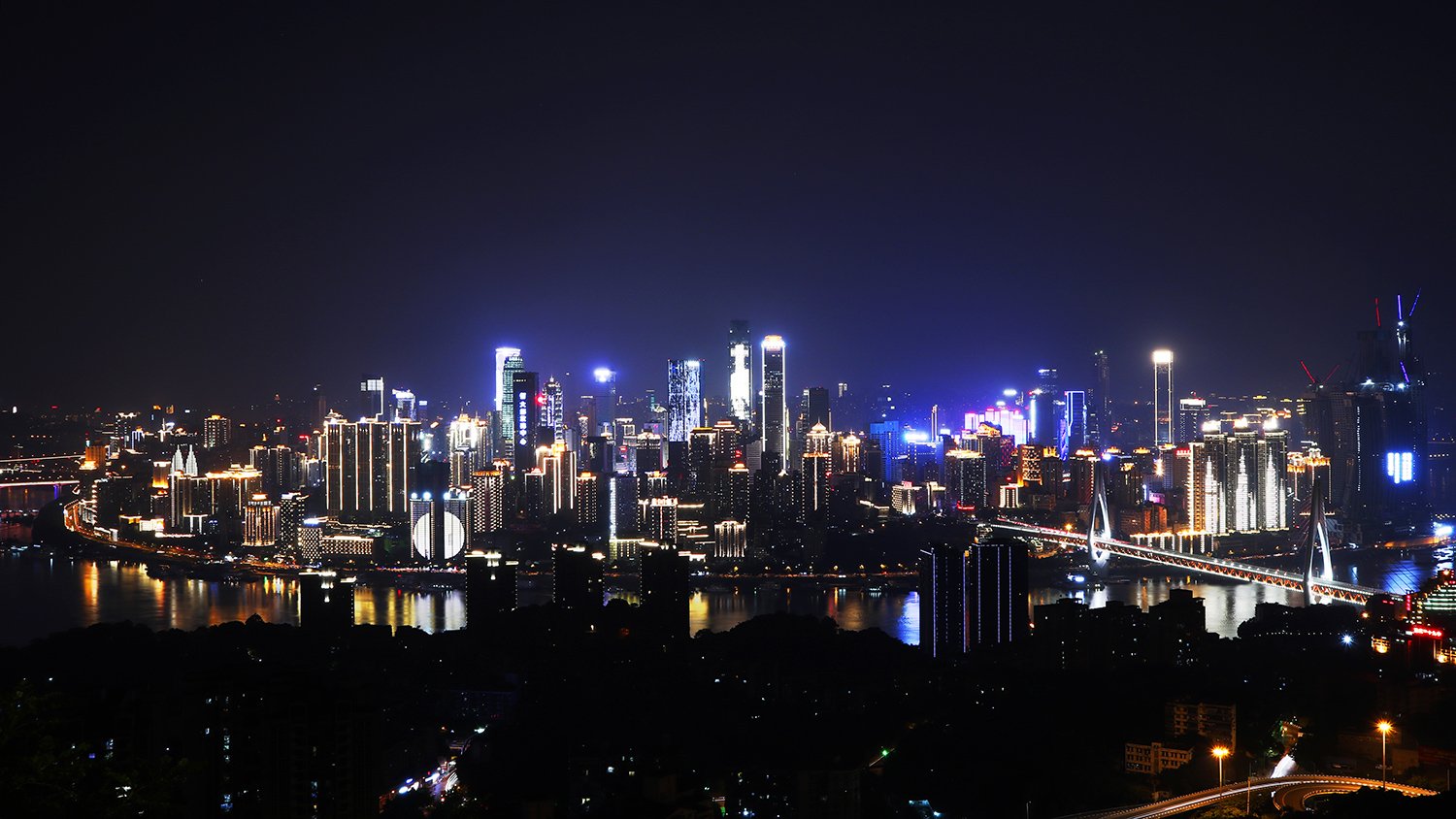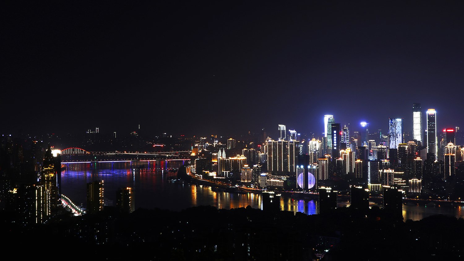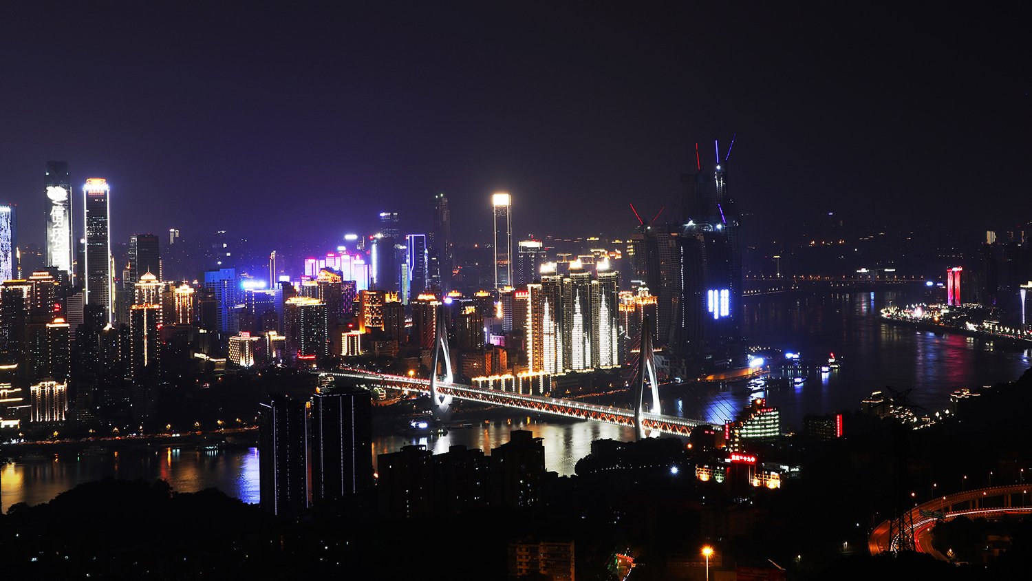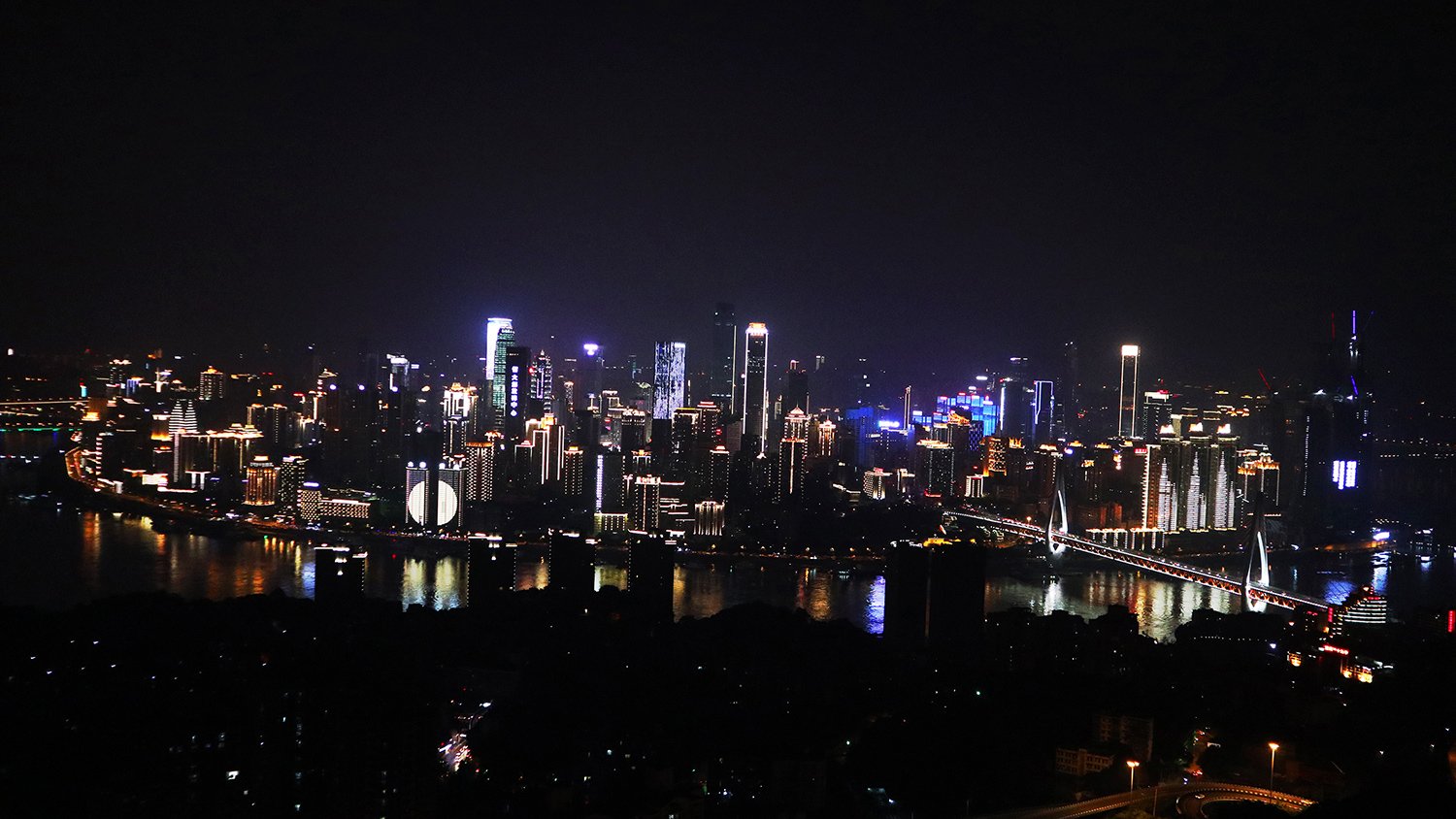 渝中半岛右半部分,照片中近处的桥是东水门大桥,白天可以看到左边的长江索道,远处还能看到东水门大桥右侧的朝天门码头和两江交汇盛景以及嘉陵江上的千厮门大桥。