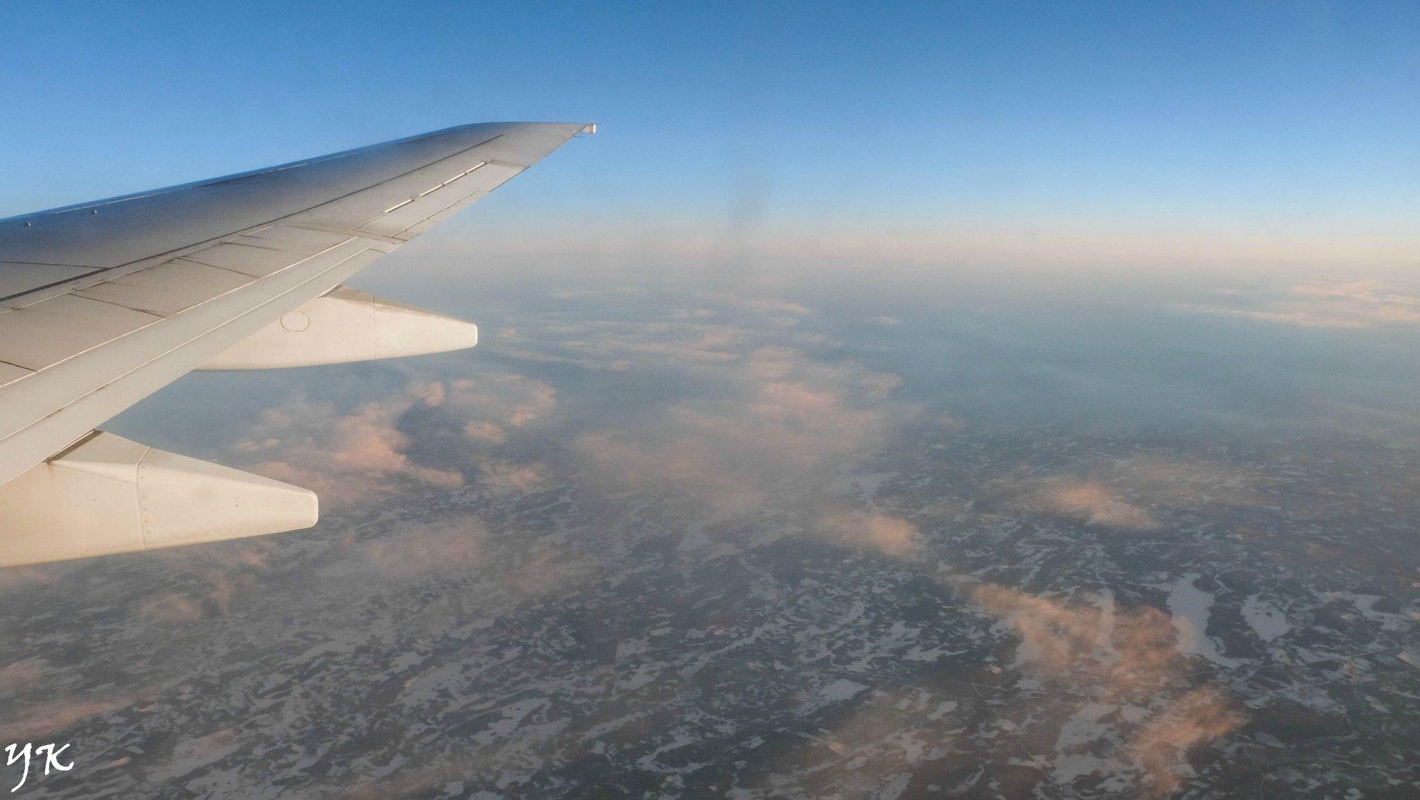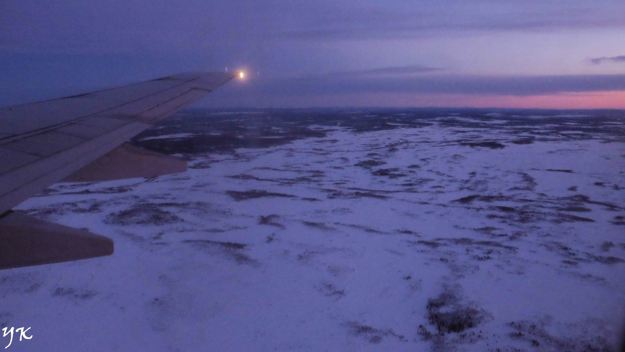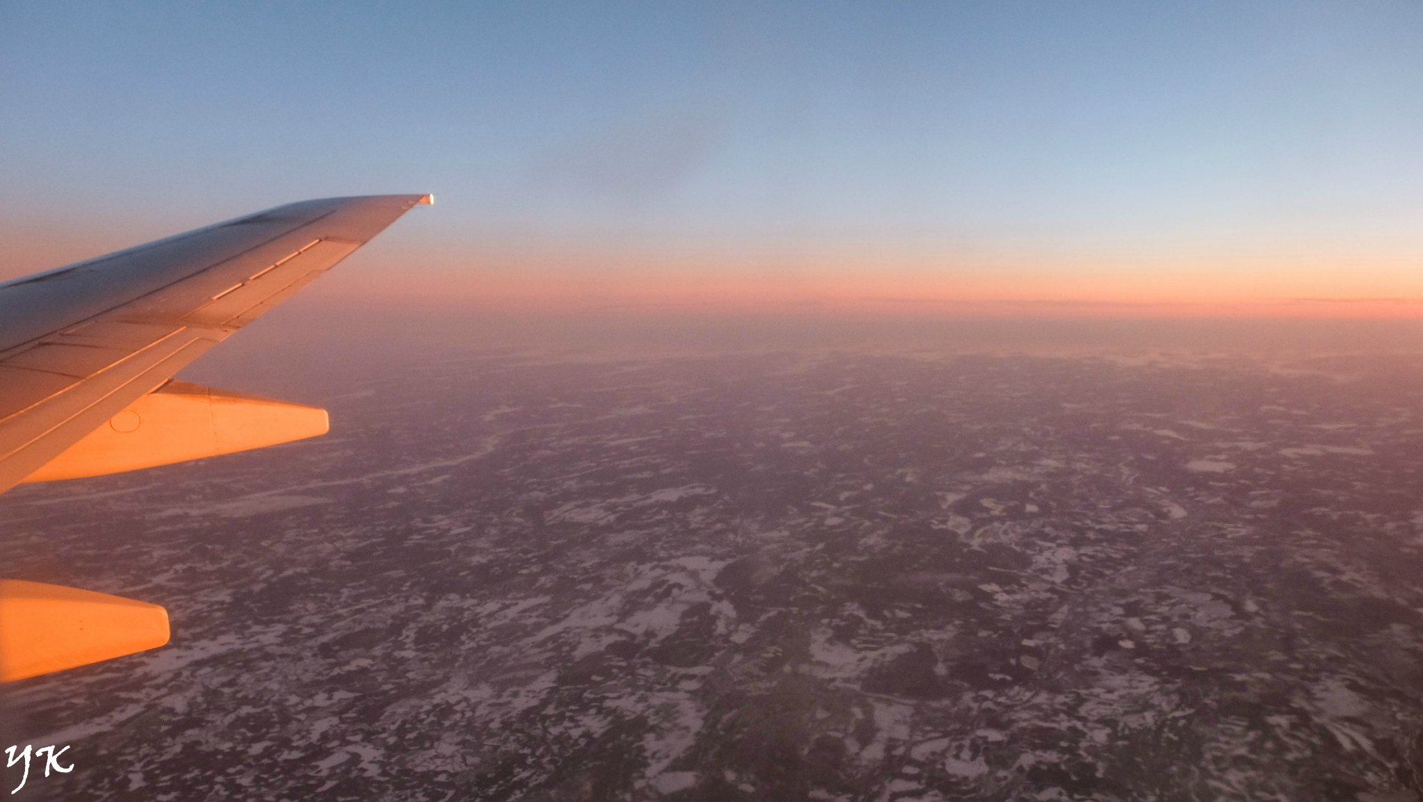 不过后来就一切都很顺利,飞机也是准时起飞~从起飞的那一刻起,我就像坐在车上的狗一样一直盯着窗外一眼都离不开……虽然是短短一个多小时的航班,但是窗外从一片雪白,到飞上云层看到蔚蓝的天空,到机翼被晚霞染红,再到天色渐渐变暗,我们就在天空中度过了北极圈冬天极为短暂的白天时光。