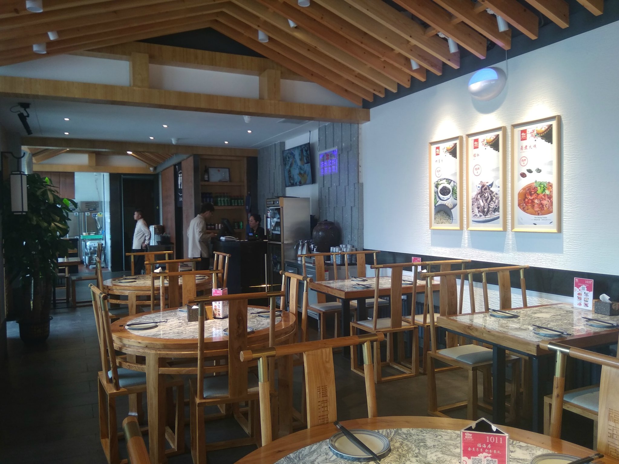 店面临街,但里面安静,一点也不喧哗。餐馆干净整洁,装修有特色,墙上贴有招牌菜的图片还有中国画,简约、时尚有现代感。