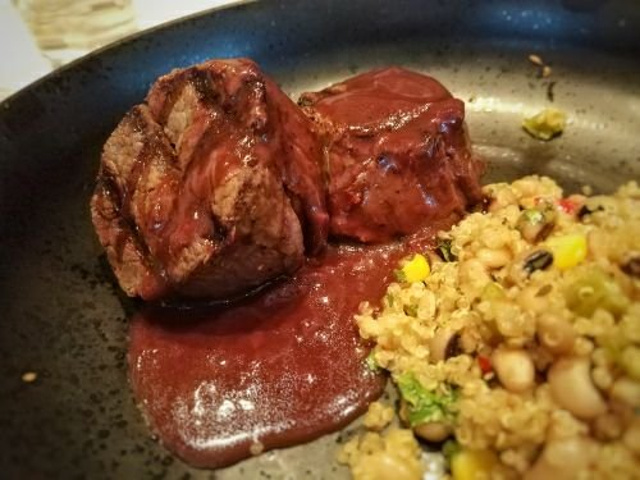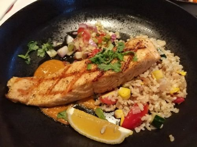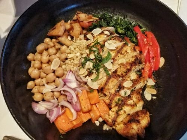 环境:位于太古里,繁华人超多地段~ 店铺很大,而且有上下两层,进门就会发现简洁、干净,环境时不错的~ 服务:服务员上菜会简单介绍菜品,虽然听了感觉和没听一样,但服务是好的~ 而且态度端正,随叫随到,有需要也能很快处理,还不错~ 不过稍有问题的是,上菜没有节奏,太快,食物打堆堆~ 菜品先给个总评:有十二道菜吧,以味道来说全部 很一般,至于优点嘛: 没有太明显的过失~ 食材没有很好,也没有差,符合所处地段及价格的定位~ 有些食材处理没有很好,但 食材都新鲜~ 中规中矩,不失败也不出彩,当做随便填个肚子的简餐,或者说健身餐来说,是说的过去的~ 抱着期望或者体验风味的态度去吃,就没有必要的了~ 牛油果三角豆泥酱盘:摆太远,加上上菜太快,还没吃,后面的都堆来了,于是没吃,不知如何~ 香烤拉法脆:麦香稍欠,但酥脆程度很好,调味无功无过,确实算是地中海风味~ 北非热风鸡肉全买谷丰盘:鸡肉纤维感重,干~ 没有处理洋葱的刺激,鹰嘴豆自身的风味很弱,酱汁浇上去后,呃,算是好看了一点吧~ 经典考伯色拉:挺好看的,颜色搭配不错,排列整齐,没有过失的一道菜,感觉很营养热量搭配比较适合健身人士~ 应该是她们家无差评产品吧~ 墨西哥鸡肉烤盘:皮烤的不错,淡芝士与鸡肉撕条结合淡淡黑胡椒的味道~ 内陷的用料加大一点,就比较好了~ 虾仁谷丰盘:吃的最多的一道菜,水果蘸了带有微咸酸的酱汁后,自然甜味变得加强,而且清爽~ 菲力牛排:服务员帮忙切成了小块,看的出来 五成熟,肉的等级虽然不高,但对肉的掌控还是不错的~ 搭配的红酒酱,完全不要蘸,红酒酱该有的味道与香气一样没有,还带有粉质酱感,就想刷墙面的多乐士一样,还不如撒上一戳岩盐来得巴适~ 烤三文鱼鱼柳:鱼柳很大一条,分量是够了的,中间的鱼肉嫩气,只是外层下面部分,有轻微煎过的糊味,估计是为了照顾厚切鱼柳的中间部位,外层的咸味过重了~ 下面的炒饭,也是厉害,能炒到一点味道都没有,也是需要技术的~ 他们家地段好、环境不错、服务热情,食材新鲜,分量足够,只是味道一般般,价格也属正常,谈不上性价比及亮点,请随缘而吃吧~