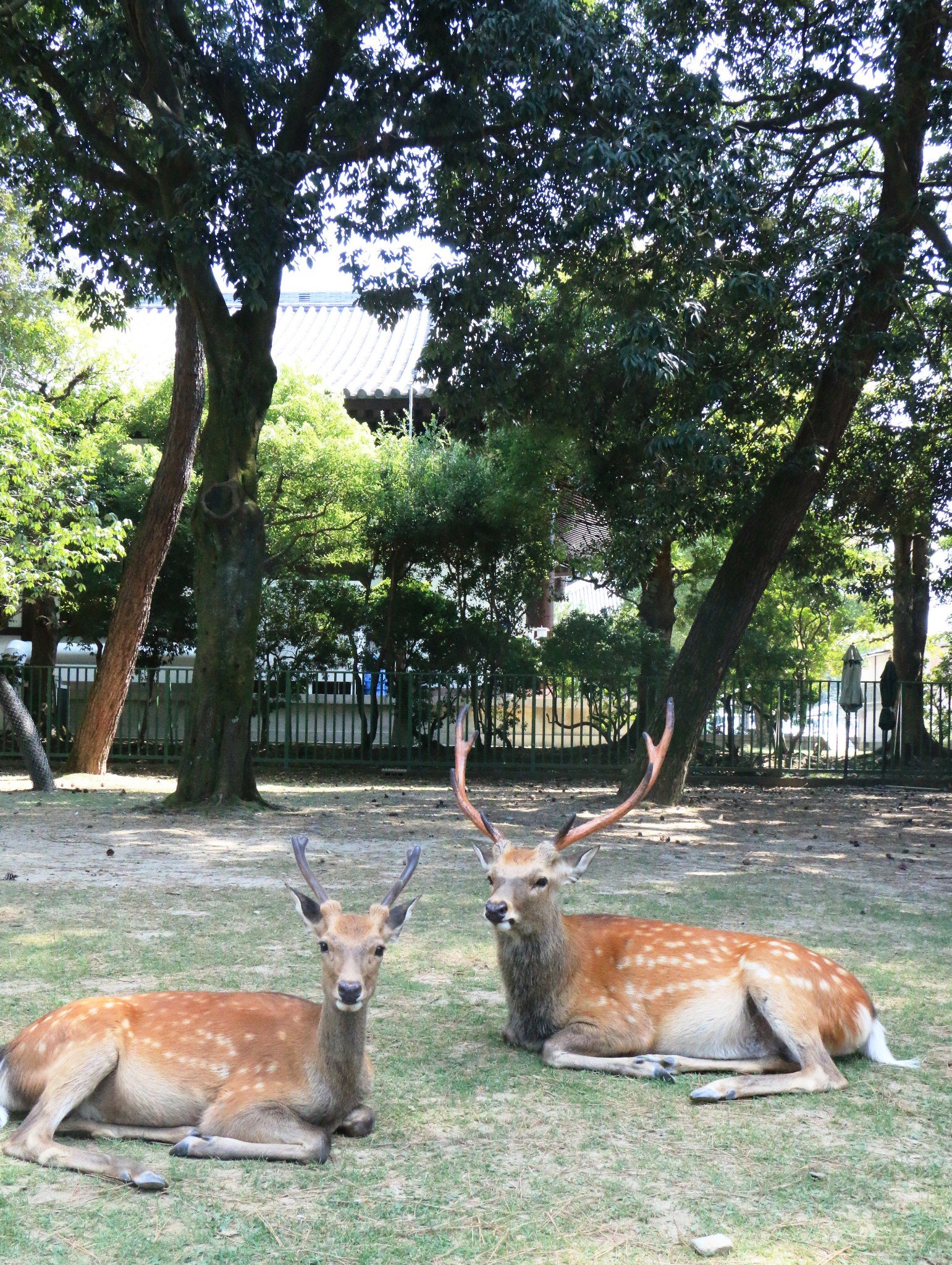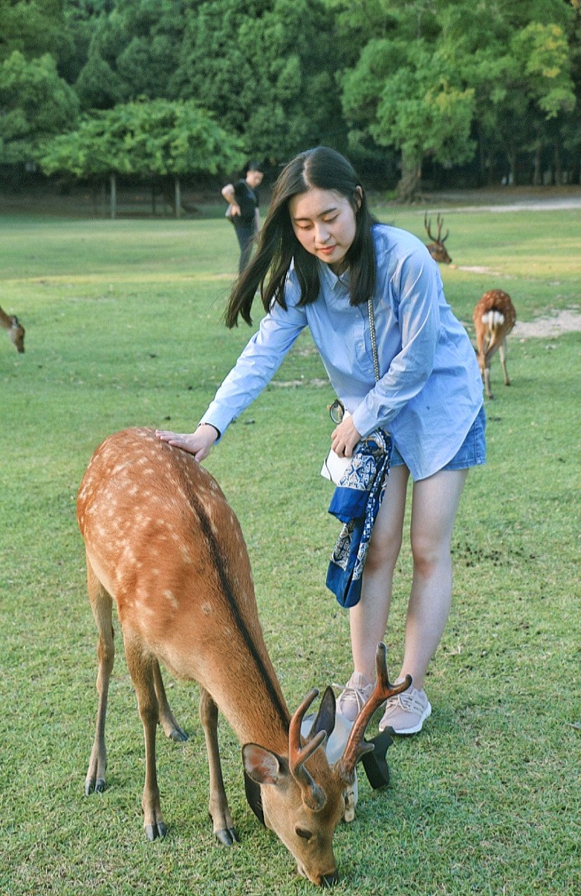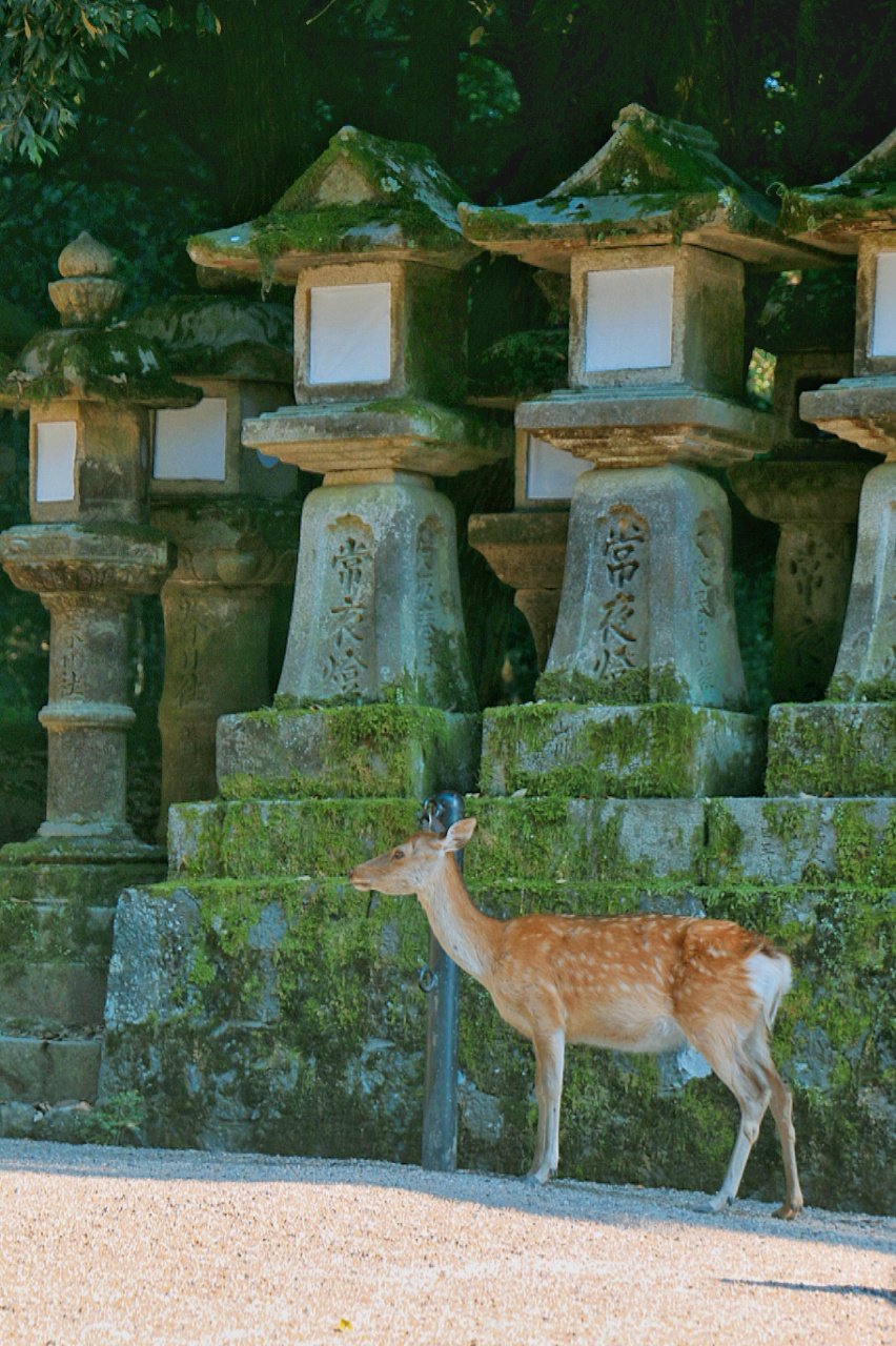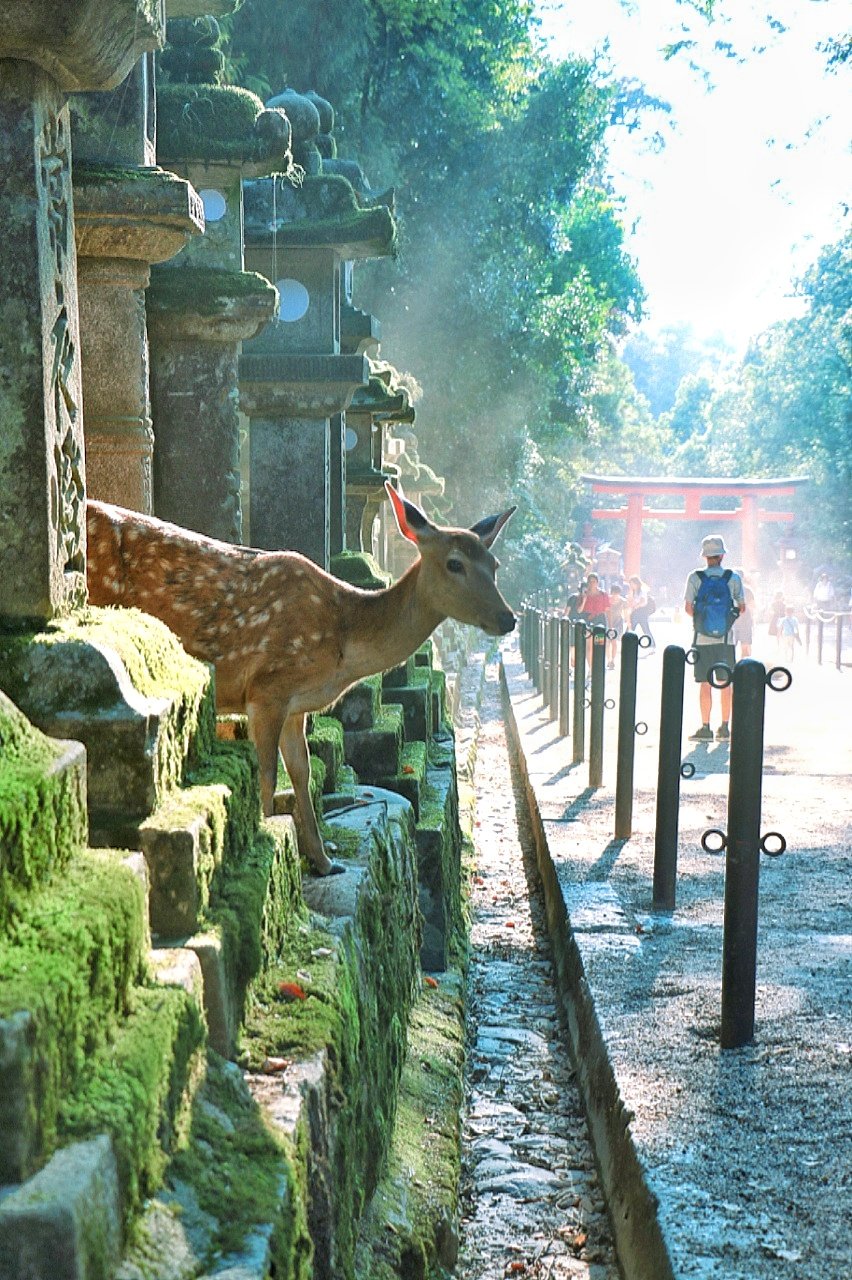 春日 大社 、 奈良 公园这些常规的景点,其实还是值得一看。有的鹿喜欢在大马路上横着,见到游客就起身悄悄跟着,是贪食的鹿,而有的鹿只在林中可见,它那圆溜溜的鹿眼一和你对上,就立马跳跃着躲开。