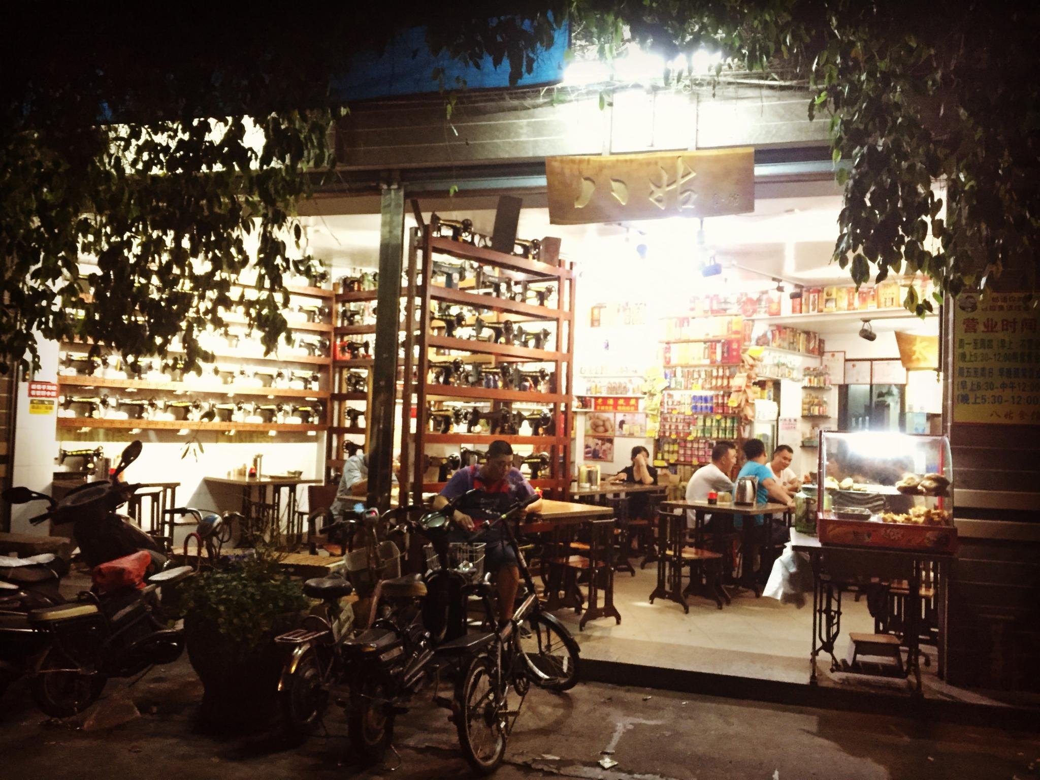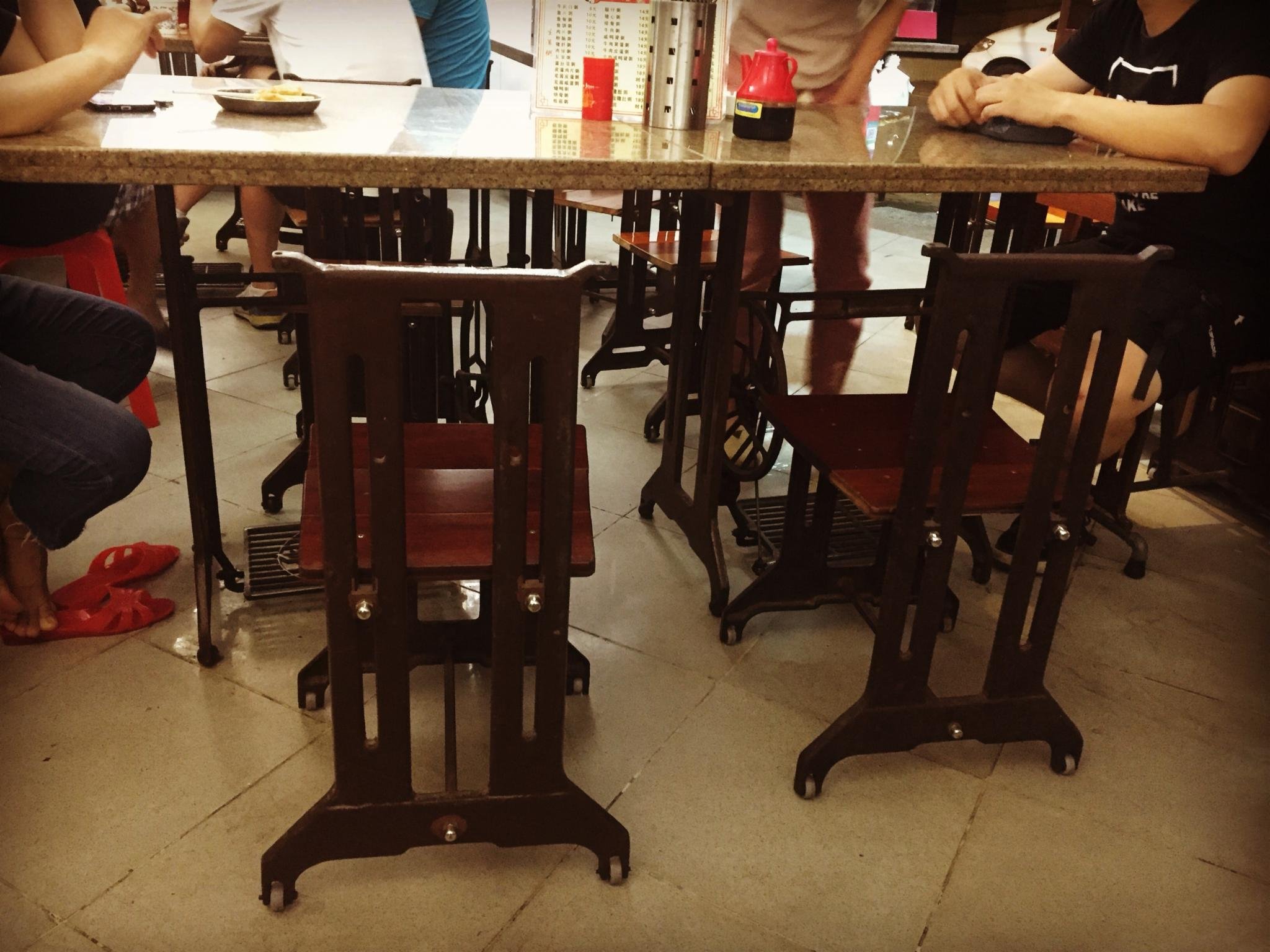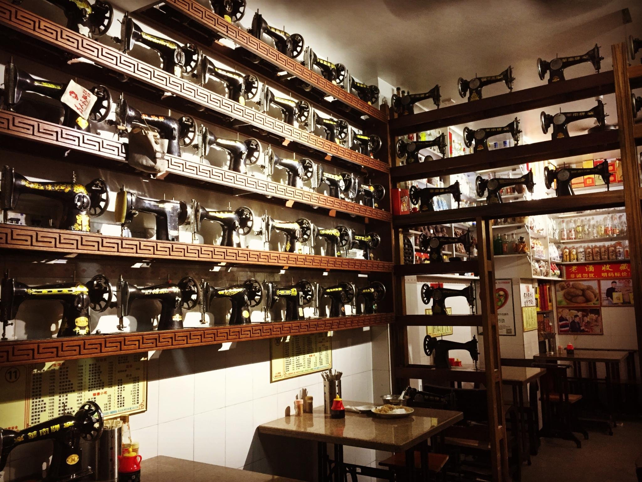晚上逛到了八姑家,这是一家看起来人气很高的夜宵店。一眼就看中了,这个全缝纫机的装修风格,感觉非常复古。