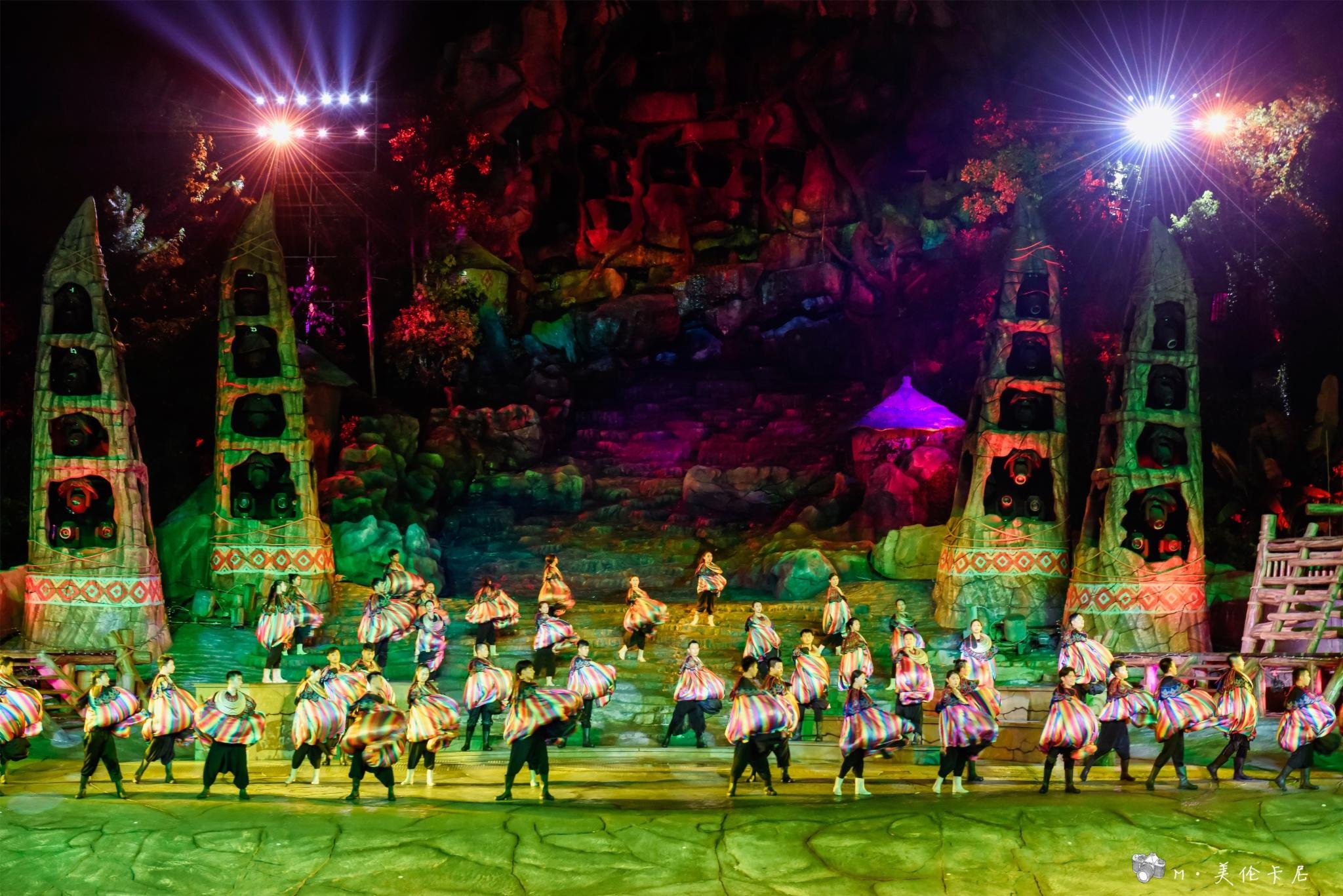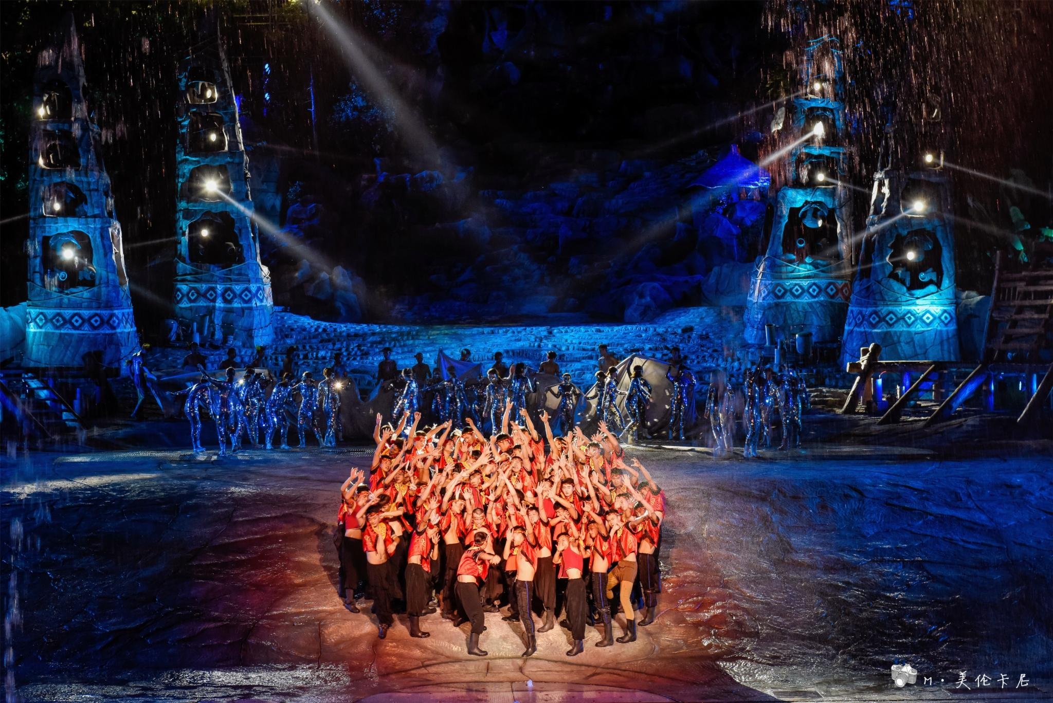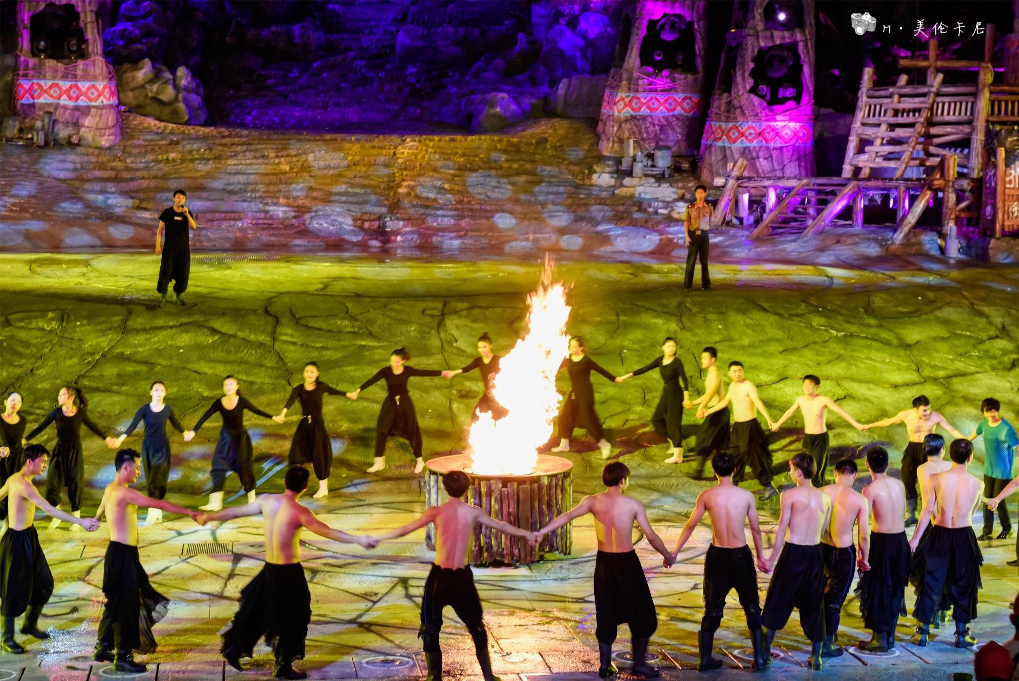 如果只看一场,我更推荐《暴雨山洪》,——阴阳山下,神秘的傩舞,诡异的祈雨仪式,野性的力量在巨变中截取上苍的密旨,霎时间,电闪雷鸣,狂风骤雨,山洪暴发了,滔天洪水瞬间倾泻而下,将整个舞台淹没…… 讲真的,虽然在国内外看过无数场各种大秀,但是场面如此之大也是前所未见。据说每天都要用掉500吨水,天山地下四面八方都被水所包围,完美的还原了山洪场景。演出最后,再和演艺人员们一起围着篝火跳起舞吧,正好可以把被打湿的衣服烤干。