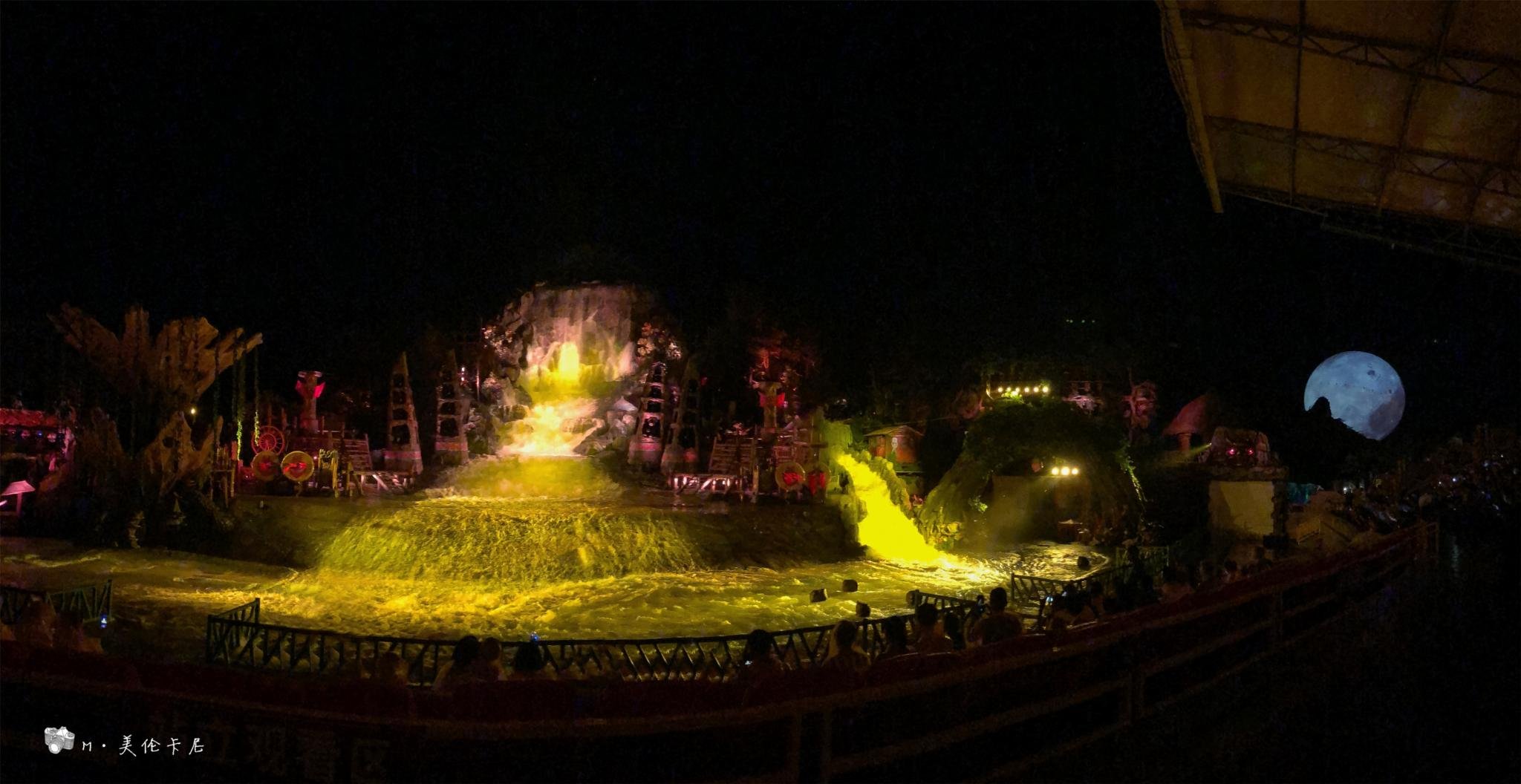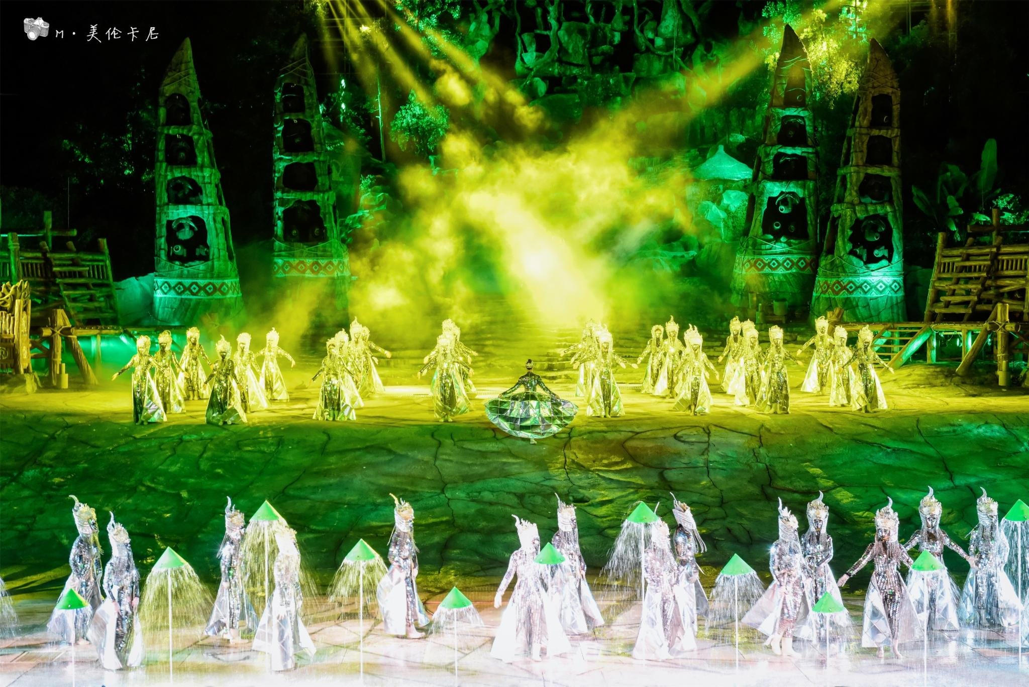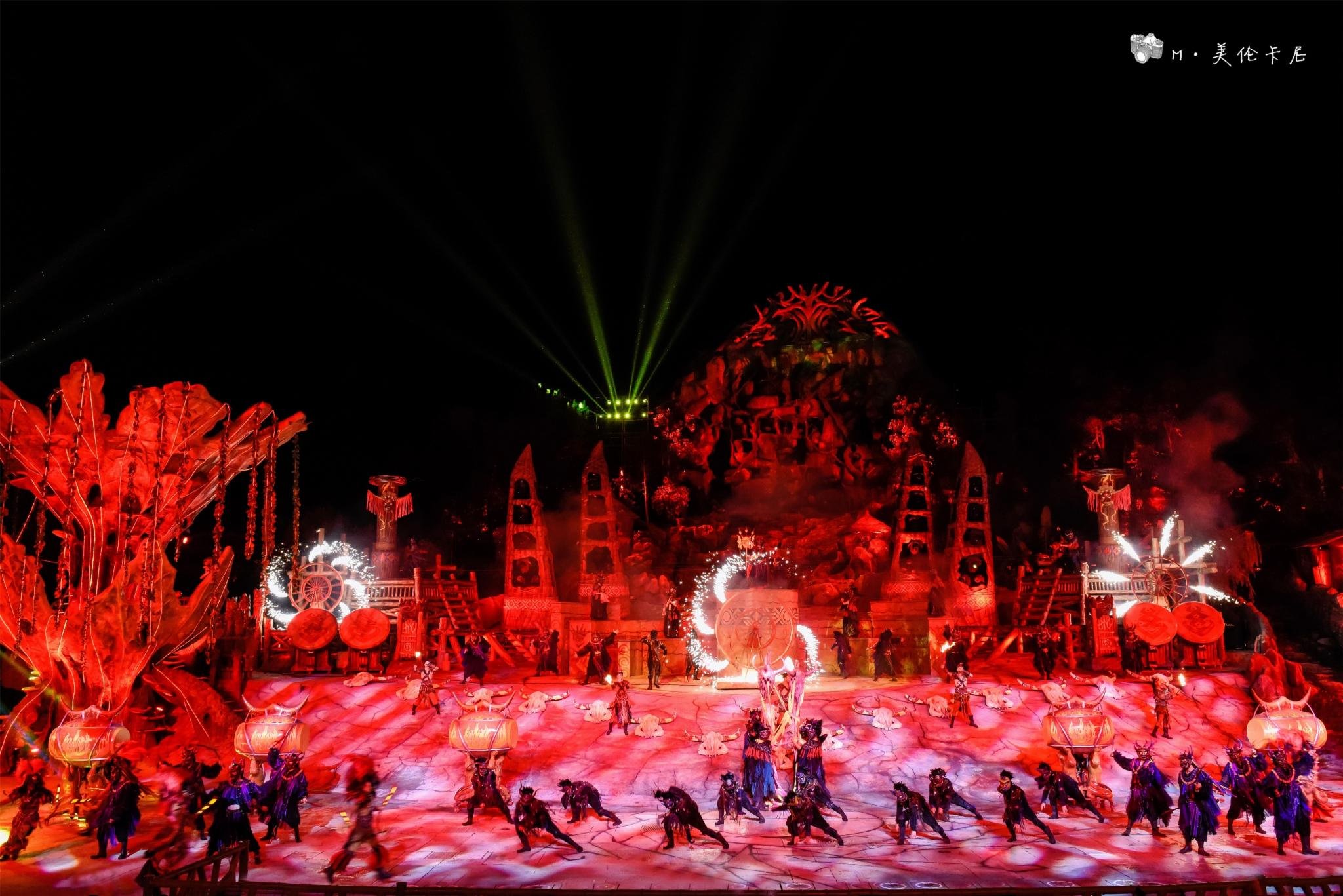 如果只看一场,我更推荐《暴雨山洪》,——阴阳山下,神秘的傩舞,诡异的祈雨仪式,野性的力量在巨变中截取上苍的密旨,霎时间,电闪雷鸣,狂风骤雨,山洪暴发了,滔天洪水瞬间倾泻而下,将整个舞台淹没…… 讲真的,虽然在国内外看过无数场各种大秀,但是场面如此之大也是前所未见。据说每天都要用掉500吨水,天山地下四面八方都被水所包围,完美的还原了山洪场景。演出最后,再和演艺人员们一起围着篝火跳起舞吧,正好可以把被打湿的衣服烤干。