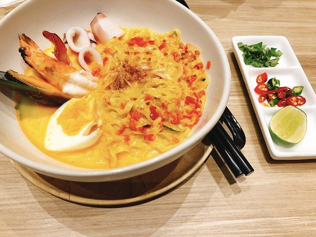 #曼谷转机# 坐了一天的飞机、车以后,实在是饿的不行了,本来1个小时的接机服务,硬是堵成了3个小时,到酒店的时候天都黑了。 然后到附近Gateway Ekamai购物中心,这里是日式购物中心,所有的店铺貌似都隐隐透着日式风格。 随便找了一家店铺,可以不用现金支付的店铺-So asean coffee,这家店铺我们进来的时候,基本上没有什么人,空位子还是蛮多的,所以相对上菜就很快了。 海南鸡饭,看着很有南阳往事的味道哦; 海鲜面,要不要这么小份?真的我没有吃饱,不过样子倒是蛮好看的,面条就是泡面里面的人那种宽面条。 海鲜的材料有鱿鱼圈、虾、一个贝壳类的食物,最后放上半个鸡蛋,摆盘满分,味道也不错,一点点辣。 搭配我点的菠萝汁,嗯,好喝;他们的水果汁还会给你搭配一杯冰,看你的喜好,要不要这个冰块,很贴心了。 不过要注意的是在商场吃饭,都需要收取额外的税费哦,这一点和国内不一样,国内额外的基本就是服务费了,这里会多一个税费。