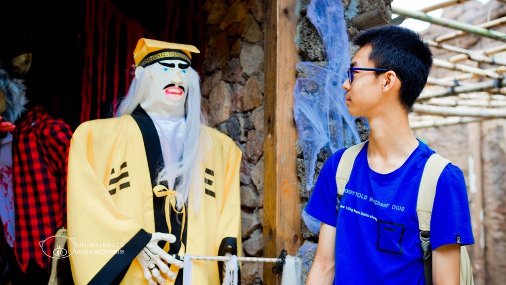我去,这个售卖“鬼怪”的店铺,大宝说我不怕,来合个影。旁边就是鬼屋,门口站着一堆人,都是观望中,想去看又害怕,都在等人带路,嘻,最后我把大宝推出来,叫他打个前阵,然后一帮子人在后面紧跟着走。