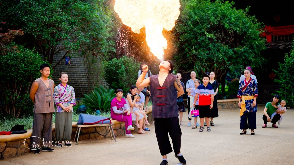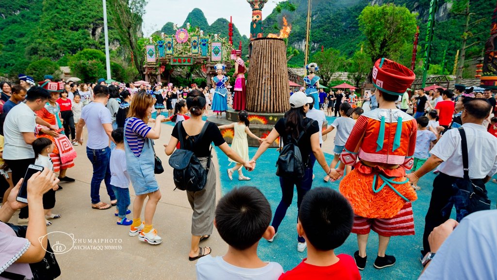 桂林千古情景区里面表演挺多的,走着走着,原来身边就有东西看,而自己也成了表演中的一份子,溶入了这个氛围内,莫土司招婿、水上飞人、锅庄狂欢、民族快闪秀等数十大演艺秀和科技秀,流连忘返,记得把表演时间标注好哦,当然,每场演出前都有景区温馨提示。