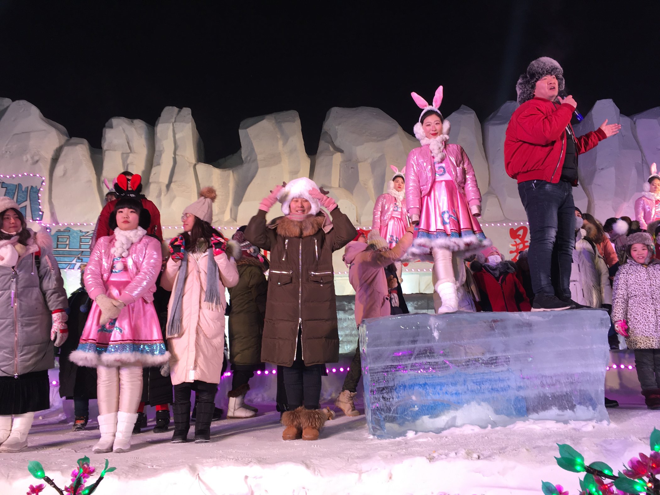 作为冰雪王国室外王牌的节目,万人迪士高热舞大风暴的主持人十分逗趣,反正温度低,大家一起来跳兔子舞。