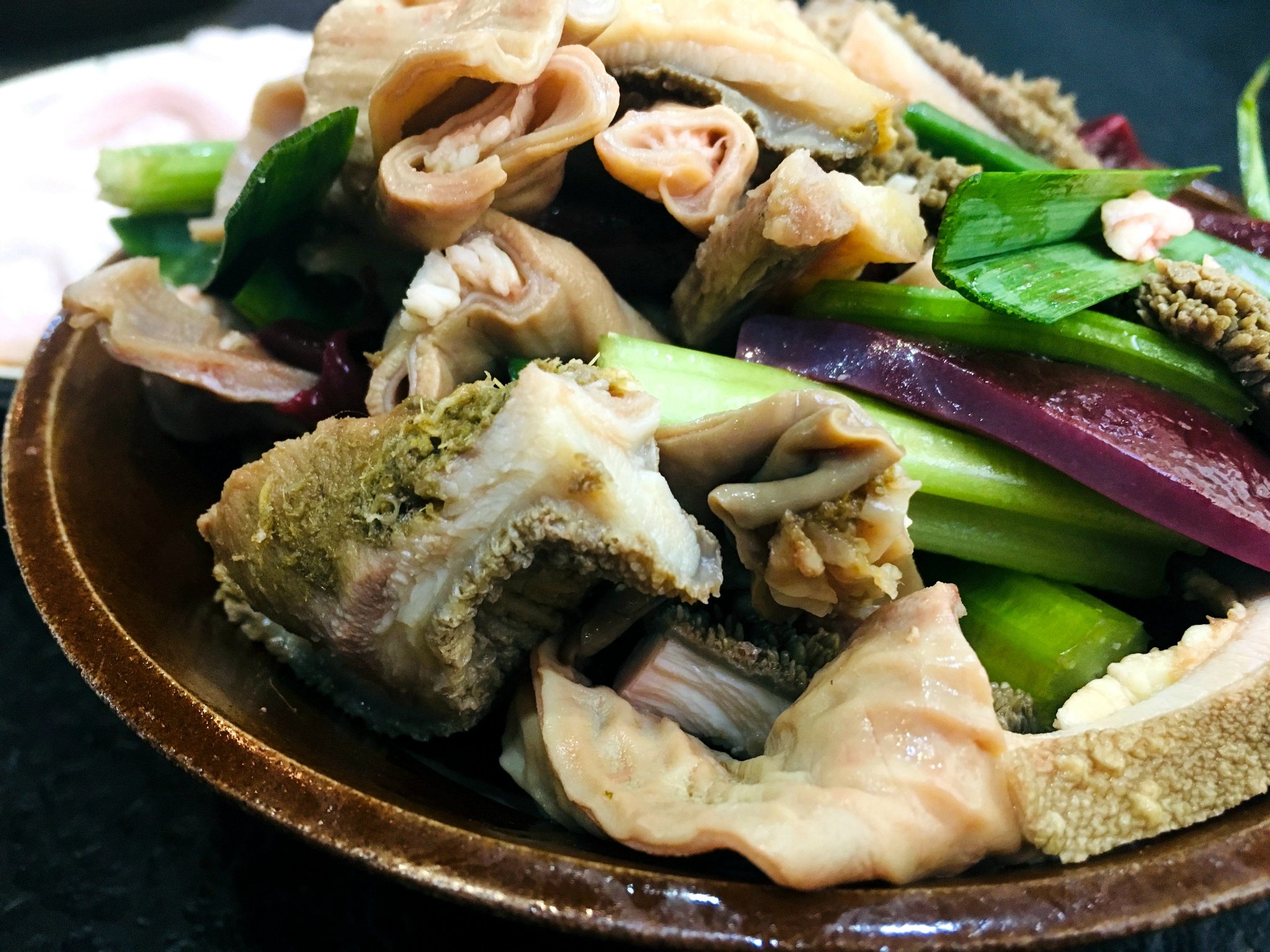 牛杂是煮制过的,大概是牛肚和牛肝牛肠混合在一起,同样也加了蒜苗和芹菜,去除腥味。
