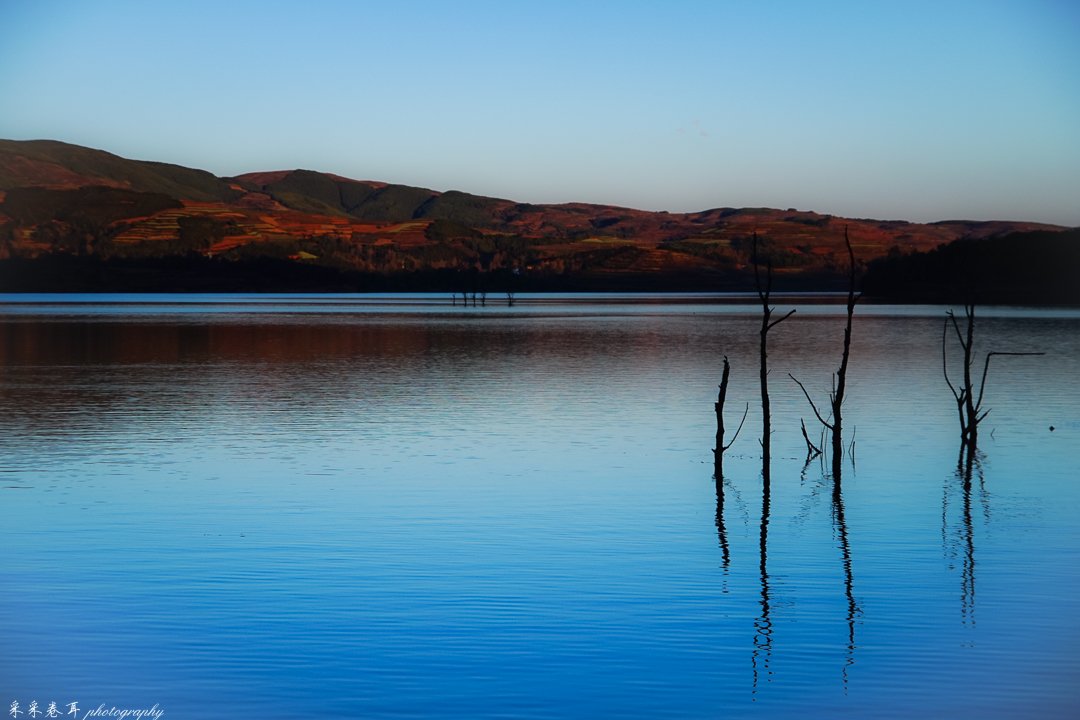 湖面逐渐平静下来,但初升的 朝阳 又开启了新的篇章。深蓝苍穹与火红 朝阳 使湖面交织成冷暖两种色彩,湖面呼应着天空。