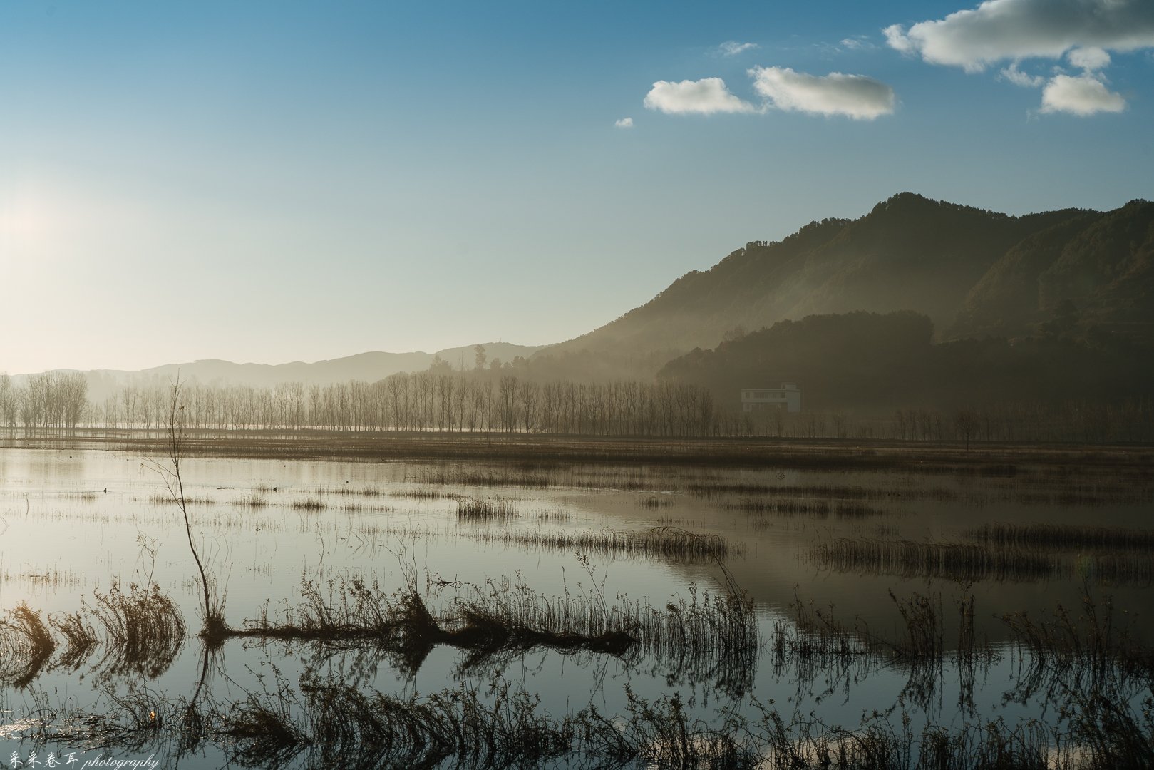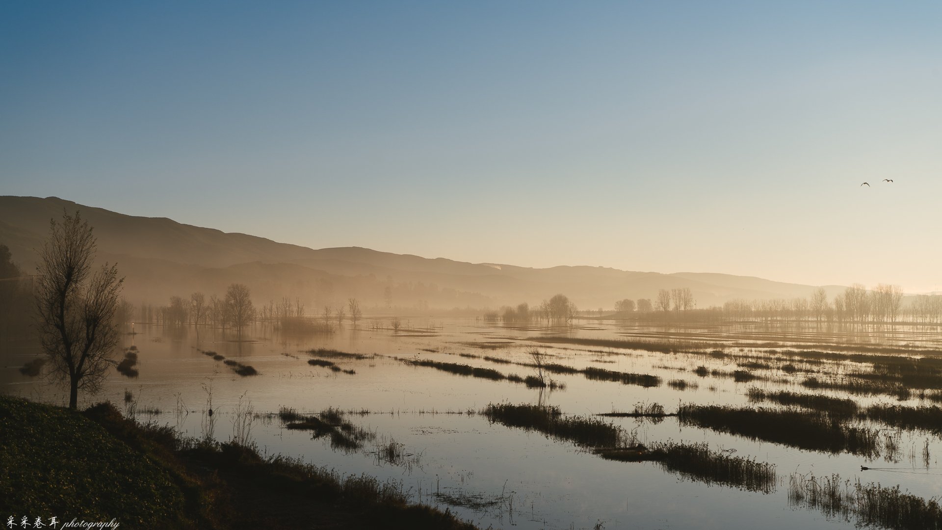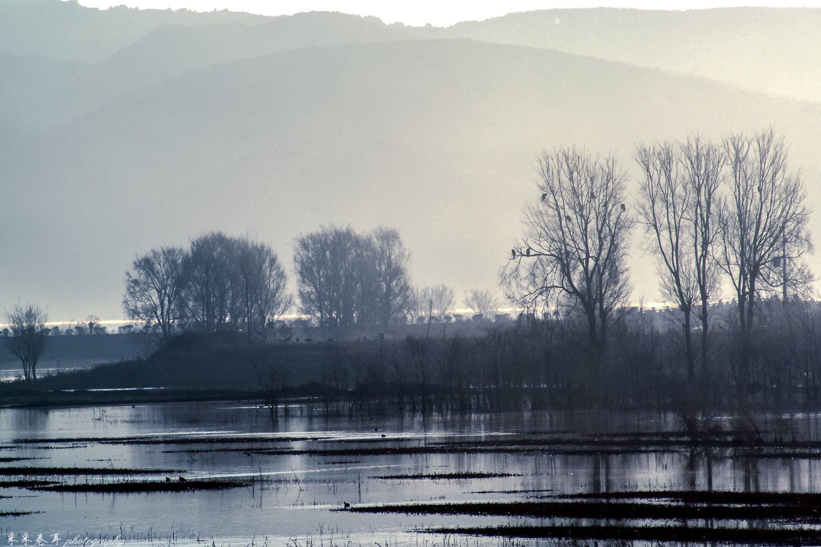 雾霭渐起,山含薄黛树含轻烟,宁静的湖面偶尔掠过一两个娇小轻盈的身影;湖水与树丛的深处,还有水鸟在柔声呢喃。
