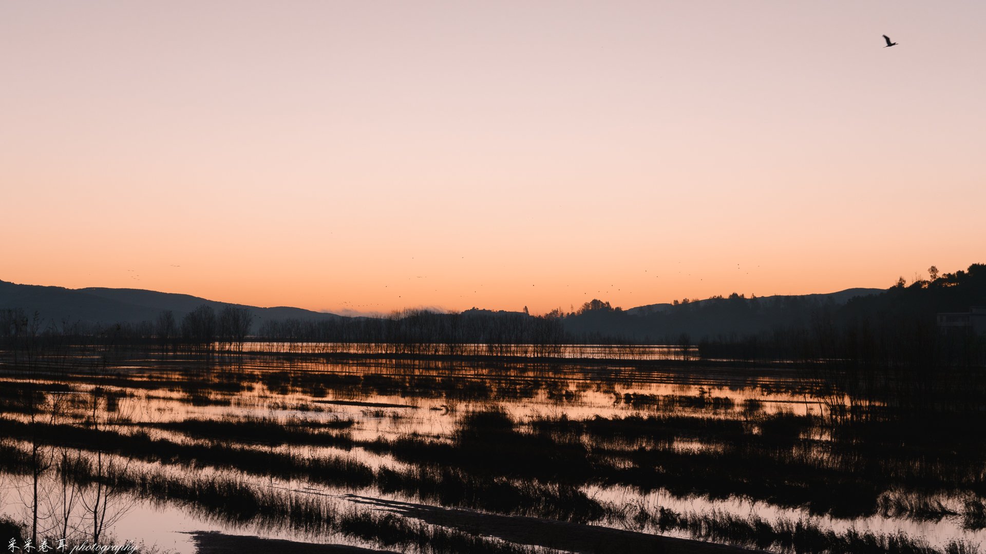 初晗的天空用温柔的粉色,将同样温柔的 念湖 也映照得异常美丽。还未迎接 朝阳 的洗礼,黑颈鹤们已迫不及待离开湖水的怀抱,展翅向天歌。