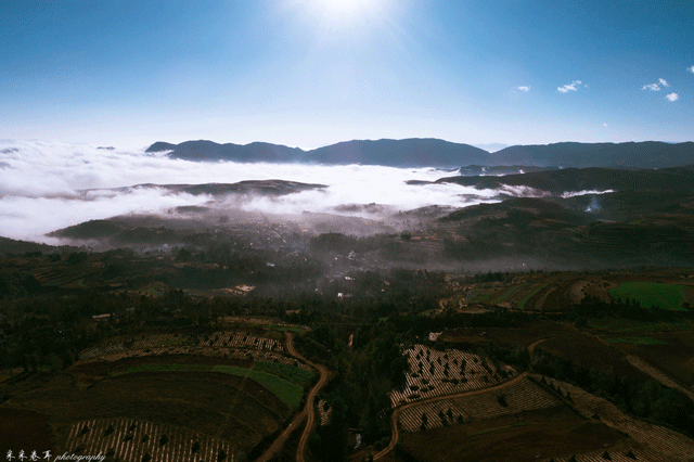 阳光下的田地,雾海中的村落,错落有致,相映成趣。