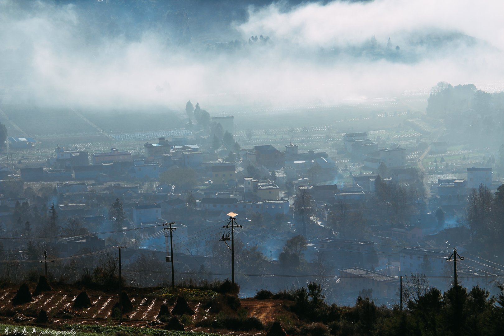 烟雾中,山脚下的村庄,仿佛独立于尘世之外,静静伫立着,只能远观,无法靠近。