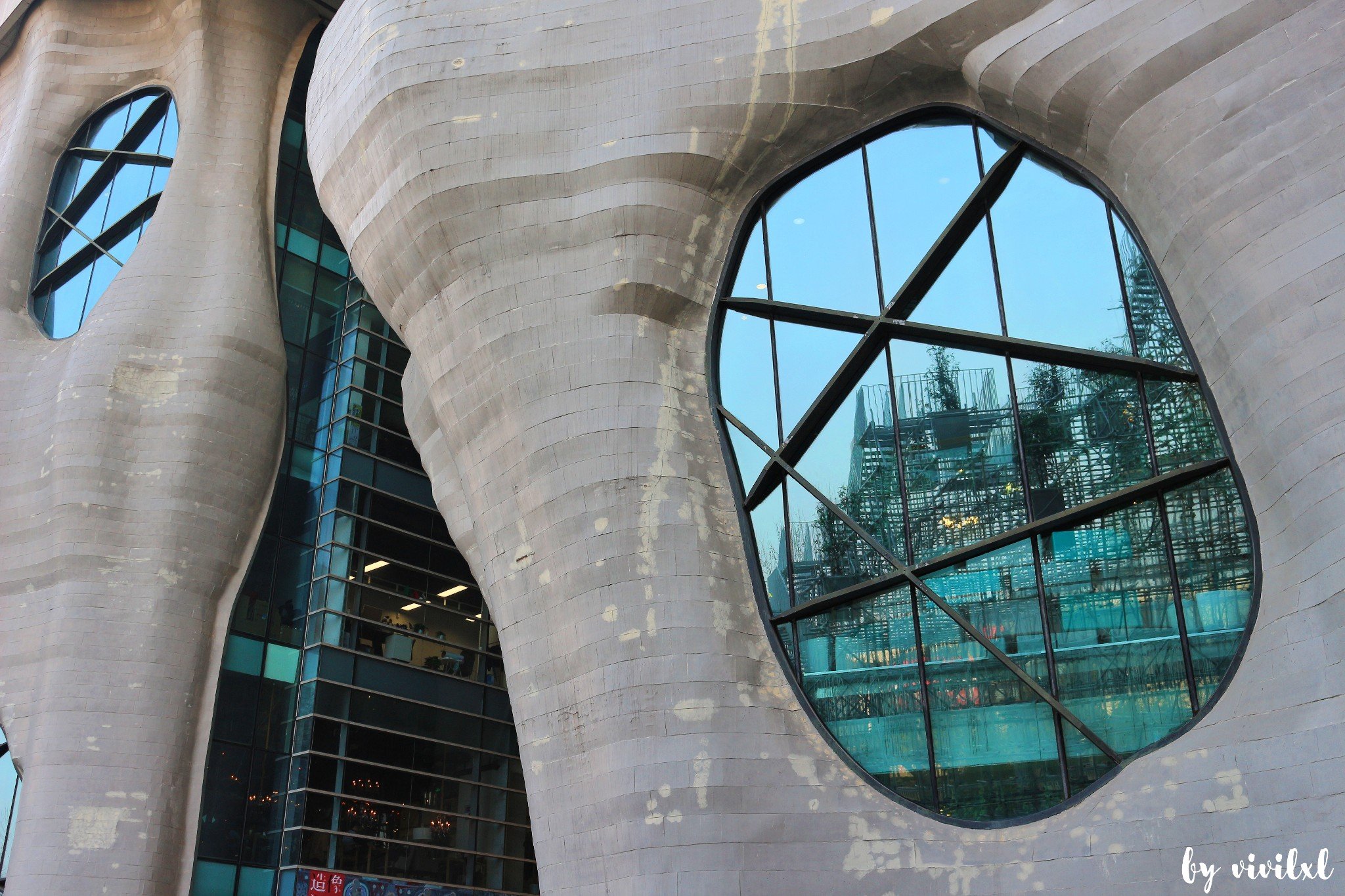 ▼证大喜马拉雅中心的设计是采用了不规矩的几何造型,每个门拱的结构都像是一个个洞穴。横七竖八的横条与映射的玻璃窗结合在一起,又是打造了一种奇异的感觉。水泥块面并没有垂直排布,而是引用了曲面,想层叠起伏的波浪,层叠的曲面像是阳光在海洋上的映射。
