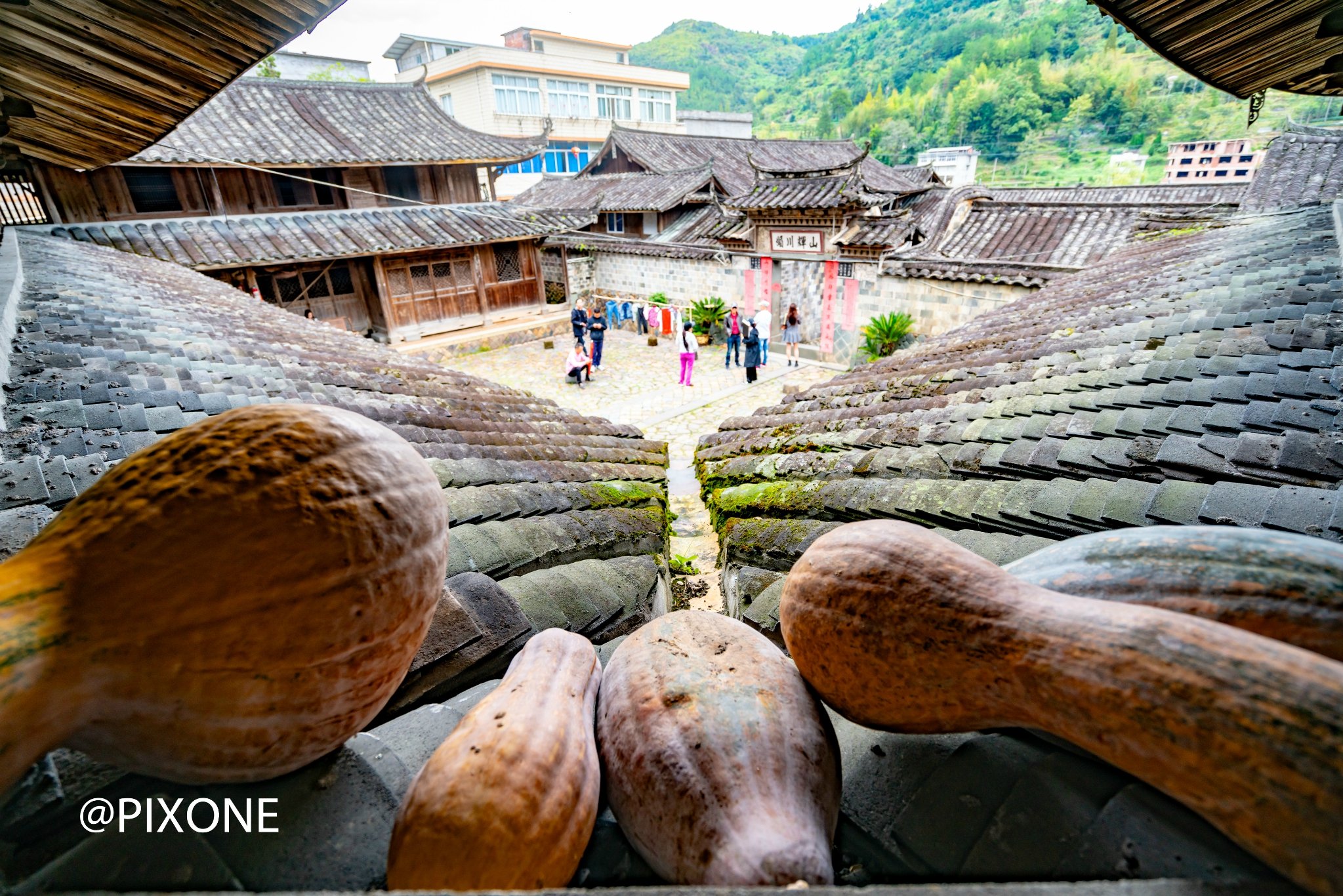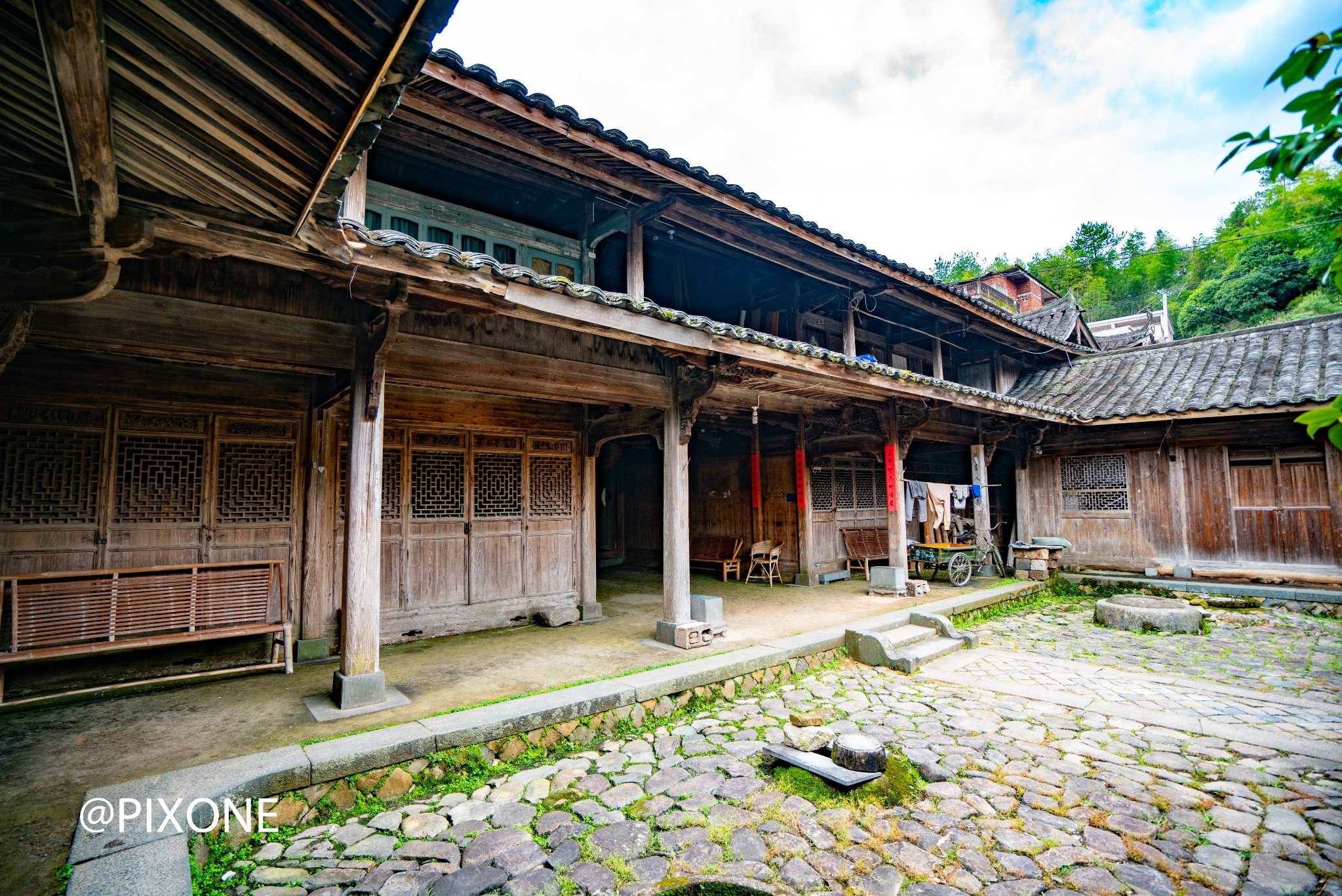 背后群山延绵起伏层峦叠嶂,一棵千年古松挺立在离屋不远的后山上,无形中给大院增添了一道风景