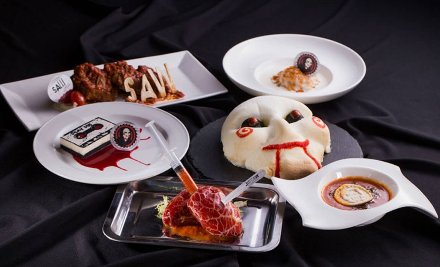 ...的冰极餐厅在哈啰喂全日祭期间也变身成了恐惧斗室主题餐厅,现场布满大家熟悉的经典Jigsaw面具