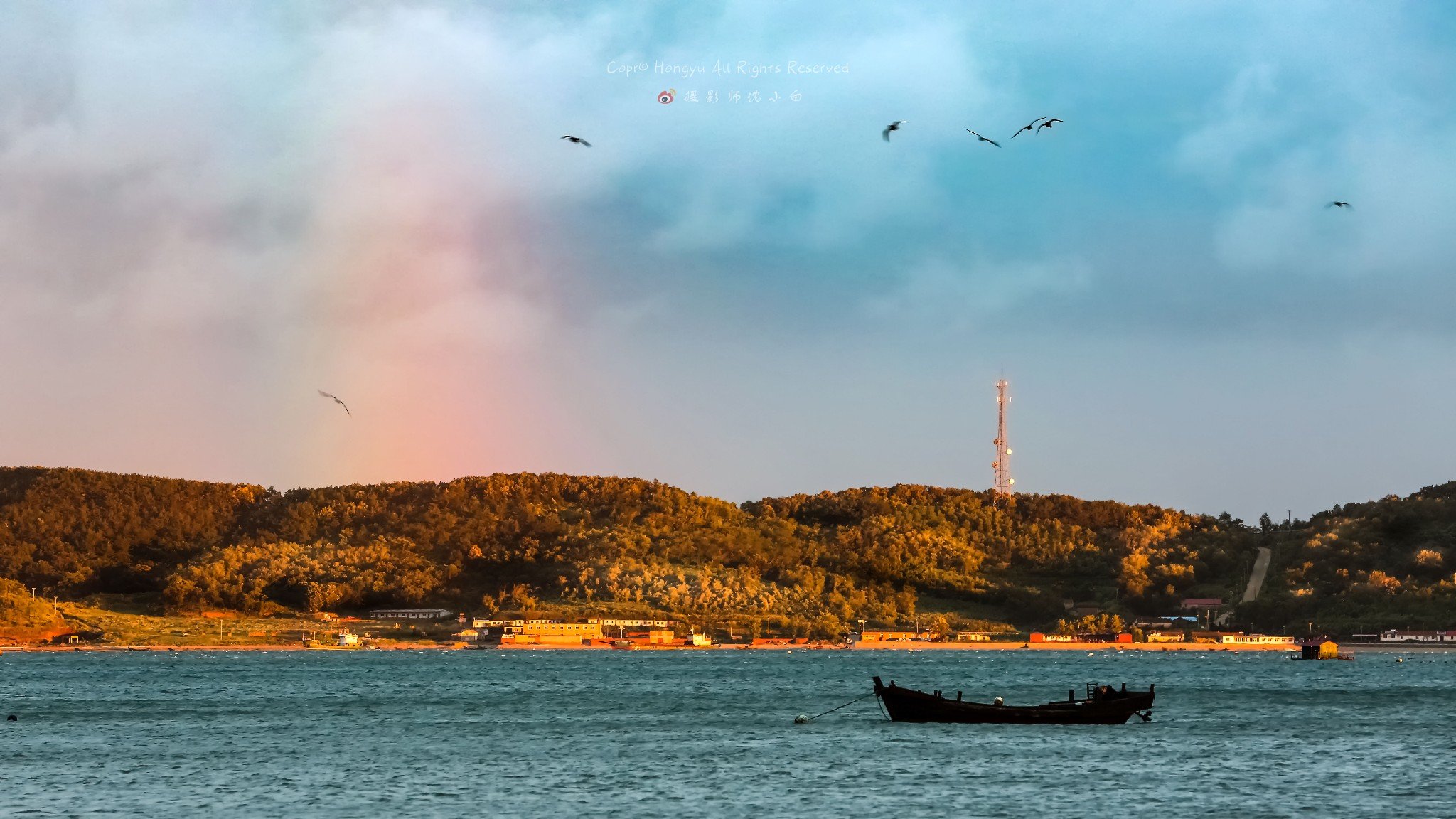 我赶紧抓住机会拍了几张,对面的海岛上划过一道彩虹