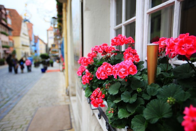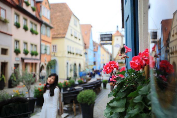 某餐厅窗前的天竺葵是很好的对焦点,发现对焦鲜花把步云莱和两旁的童话房子拍摄得虚化,也是很好看的。