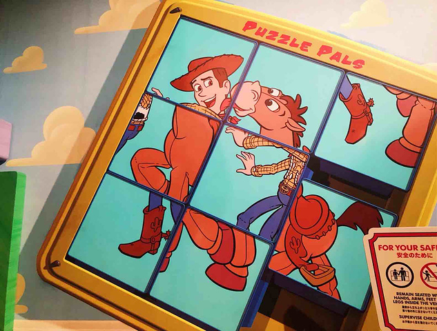 #2018.10 霓虹四度游之东京# 迪士尼海洋最期待度就是玩具总动员咯。进了园区就直奔这里拿Pass卡,结果依然被拿光了。 漫长的两小时排队时光,感觉腿要站断掉了。 结果就给我一副3D眼镜,在转转杯里玩打枪??!! 怎么说我们也是玩街机长大的一代啊。。这是让我们回忆青春吗。。。这对得起我站到腿酸的两小时么!! 当然,不排队的话,还是可以玩玩的。但这个,是迪士尼排队最久的项目,没有之一!! PS:晚上的胡迪看起来有点小恐怖,像不像要把嘴巴里的人都吞噬掉的样子?