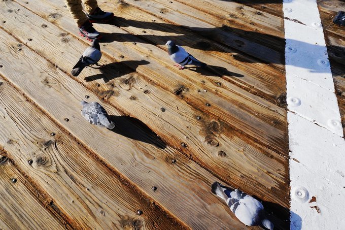 在码头的栈桥上有很多海鸟,不怕人,而且嘴很馋