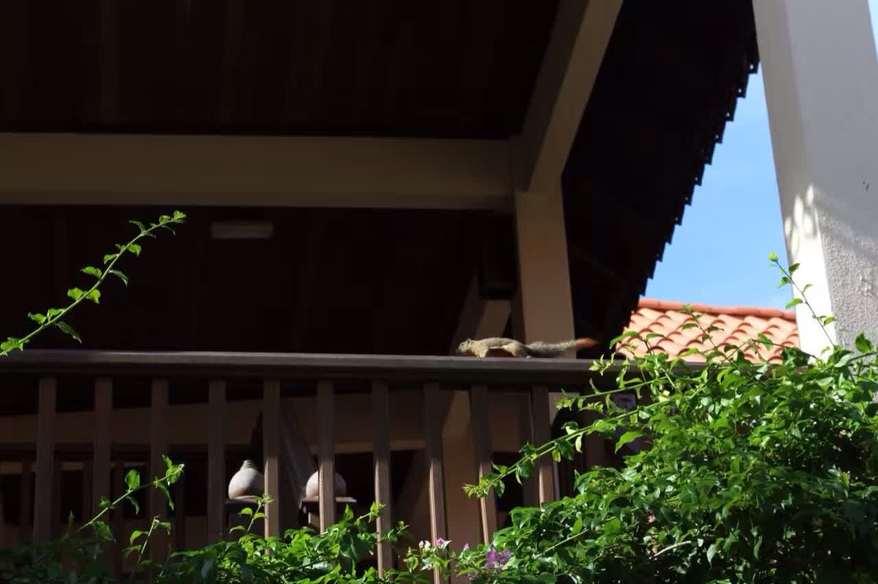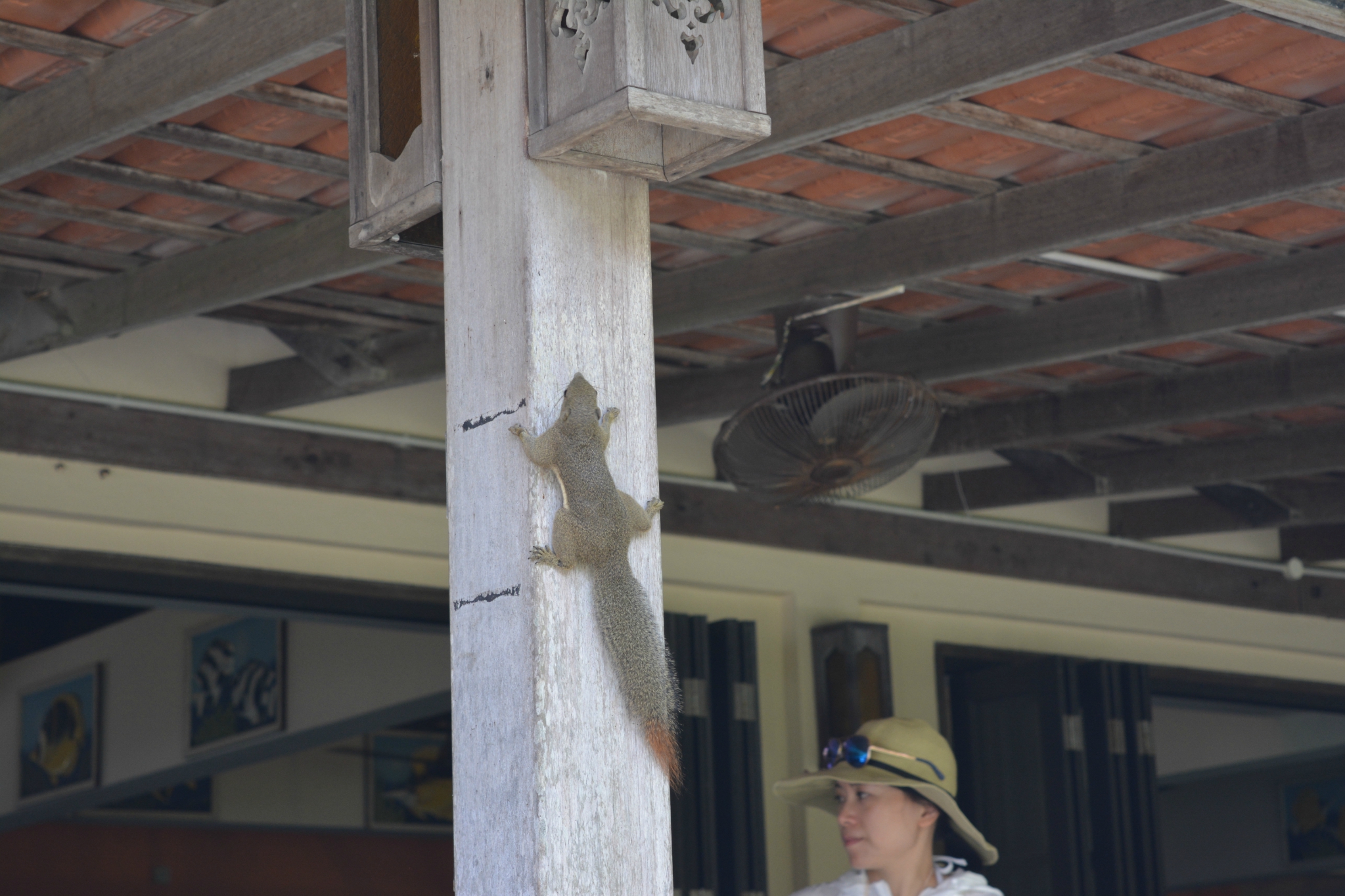 一只可爱的小松鼠正沿着酒店大堂的柱子欢快的往上爬。