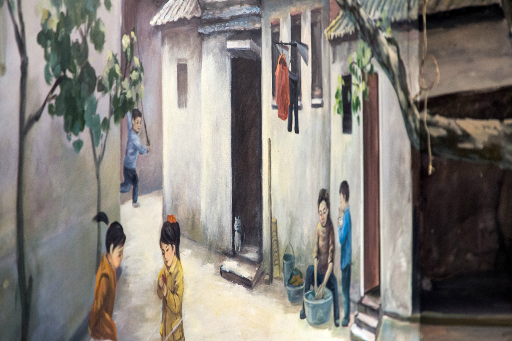 穿过人群找到一个靠近角落的位置坐下,回过头来再仔细看看这里,蓝色、红色衣服的服务员,绿色的邮政信箱,张贴着香港明星海报的前台还有小时候玩耍的壁画瞬间把人的思绪带回到了小时候的时光。