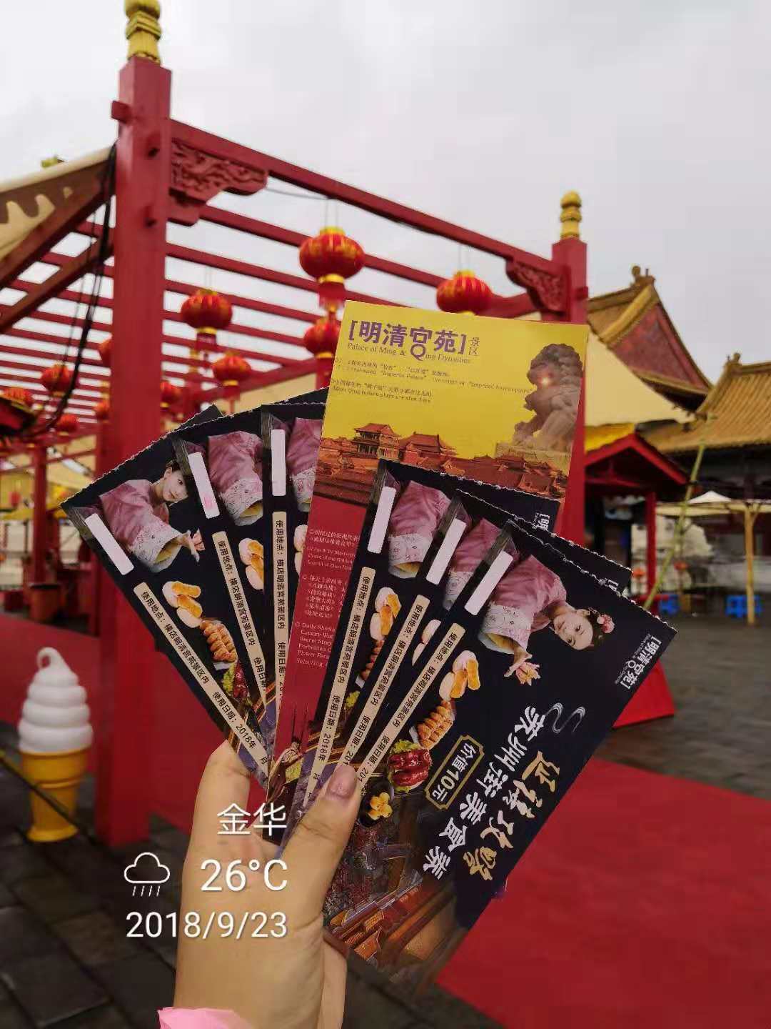 来到了明清宫苑,看到了好大的一个停车场,之前来的时候还担心人很多,车没地儿。在这里我要和广大的盆友们说,放心人很多,车能停。但是我们去的这天,天气不是很好,居然在下雨,又在外面的小卖部买了两个人的套装花了90元。。。很无奈。。。