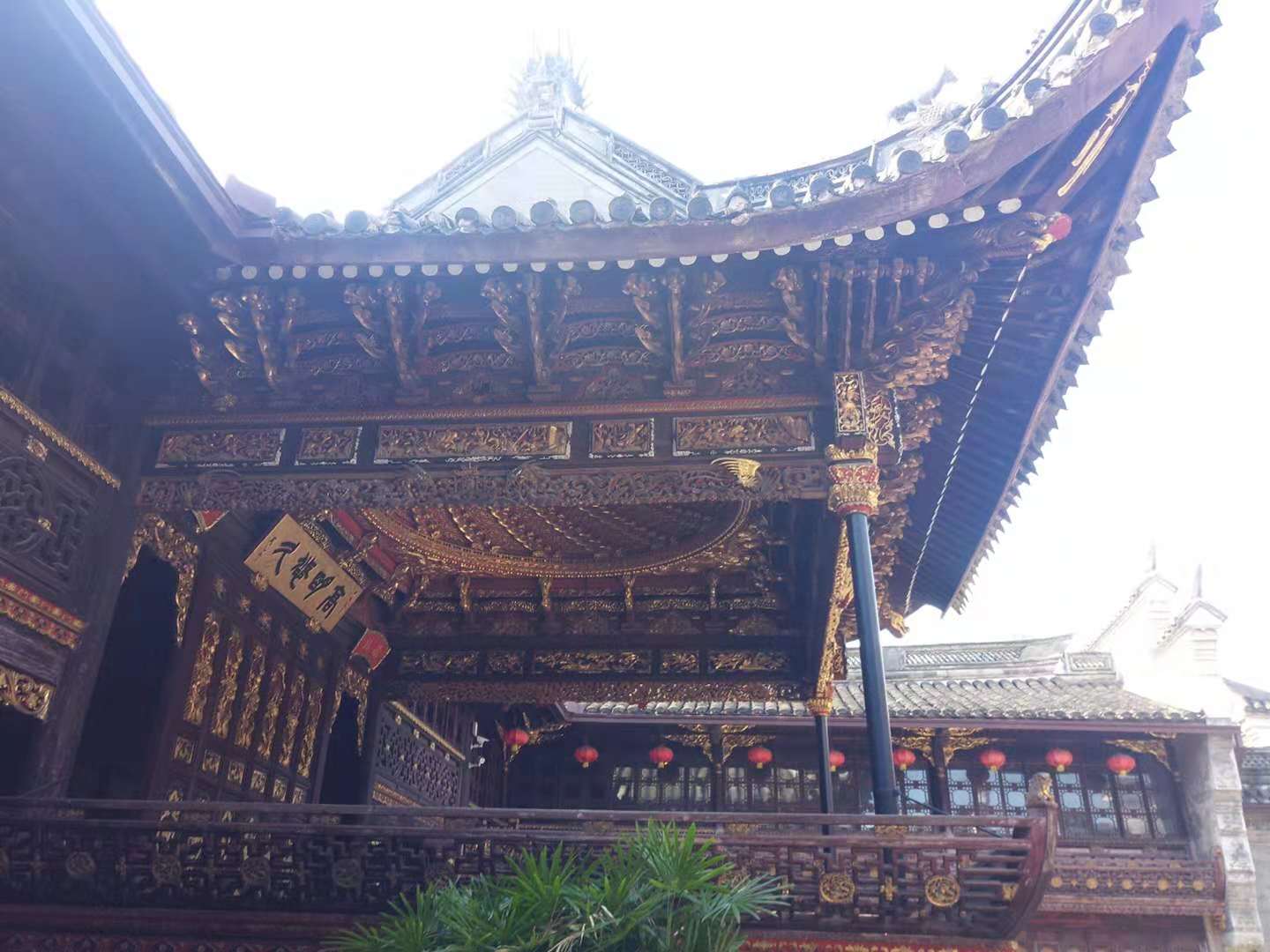 鸡笼顶(穹形藻井顶): 戏台的屋顶为单檐歇山顶,由十六个斗拱承托