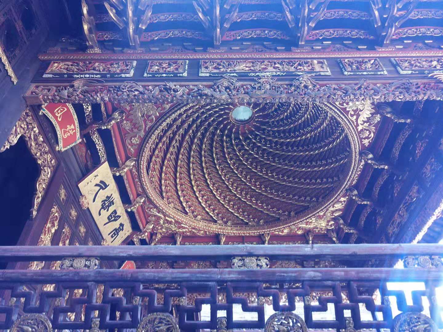 “天然麦克风”穹形藻井顶 用近千块板榫搭接构成,以16层大小不一的如意斗拱螺旋状盘旋而上逐层收束,最后集中于戏台正中上方的铜镜四周,不用一枚铁钉。穹形藻井顶除装饰作用外,还有扩大音效功用,一如今天的各类“麦克风”。