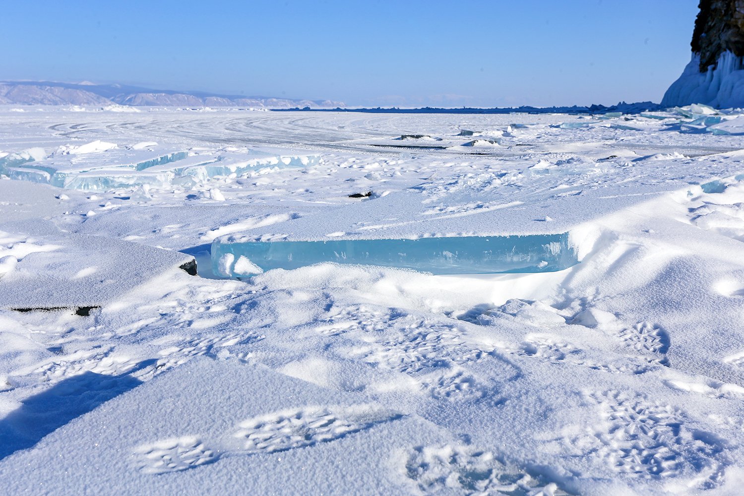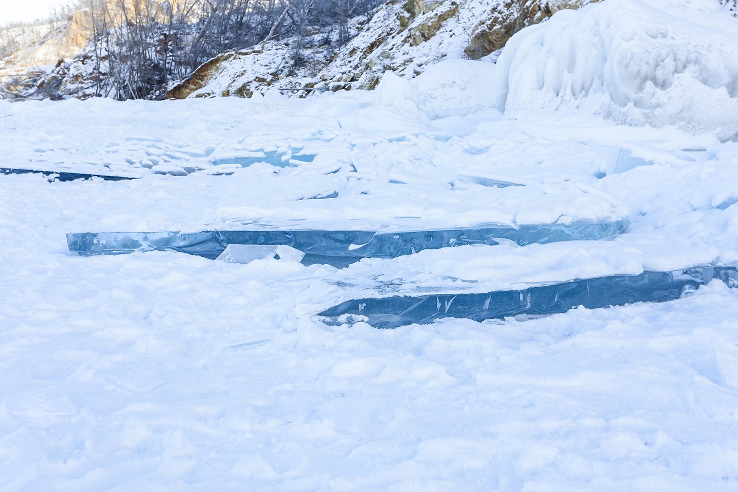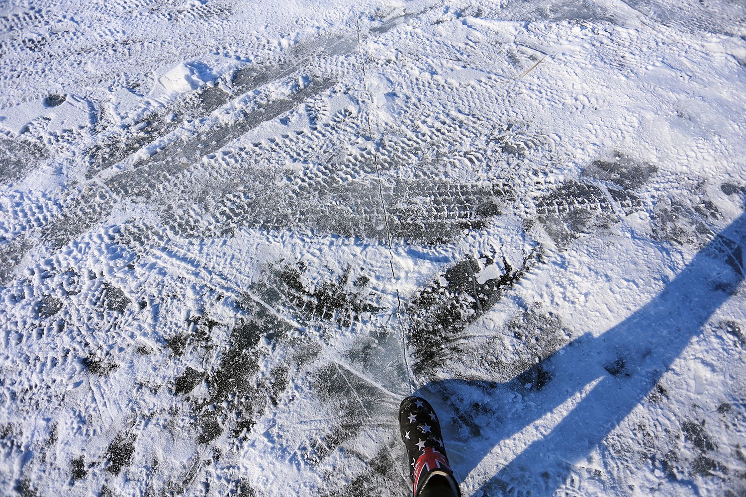 车开过的地方雪化开了,可以看到下面的冰面,都是裂缝。